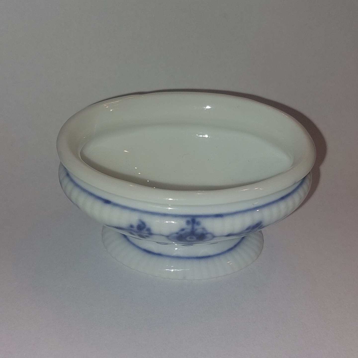 Royal Copenhagen:.Musselmalet saltkar på fod. I perfekt stand uden skader eller reparationer. Fremstillet i slutningen af 1800-tallet. Tilsvar modelnummer 1/196. Fabriksmærket på bunden. Mål: H. 3,5 cm L. 7,5 cm