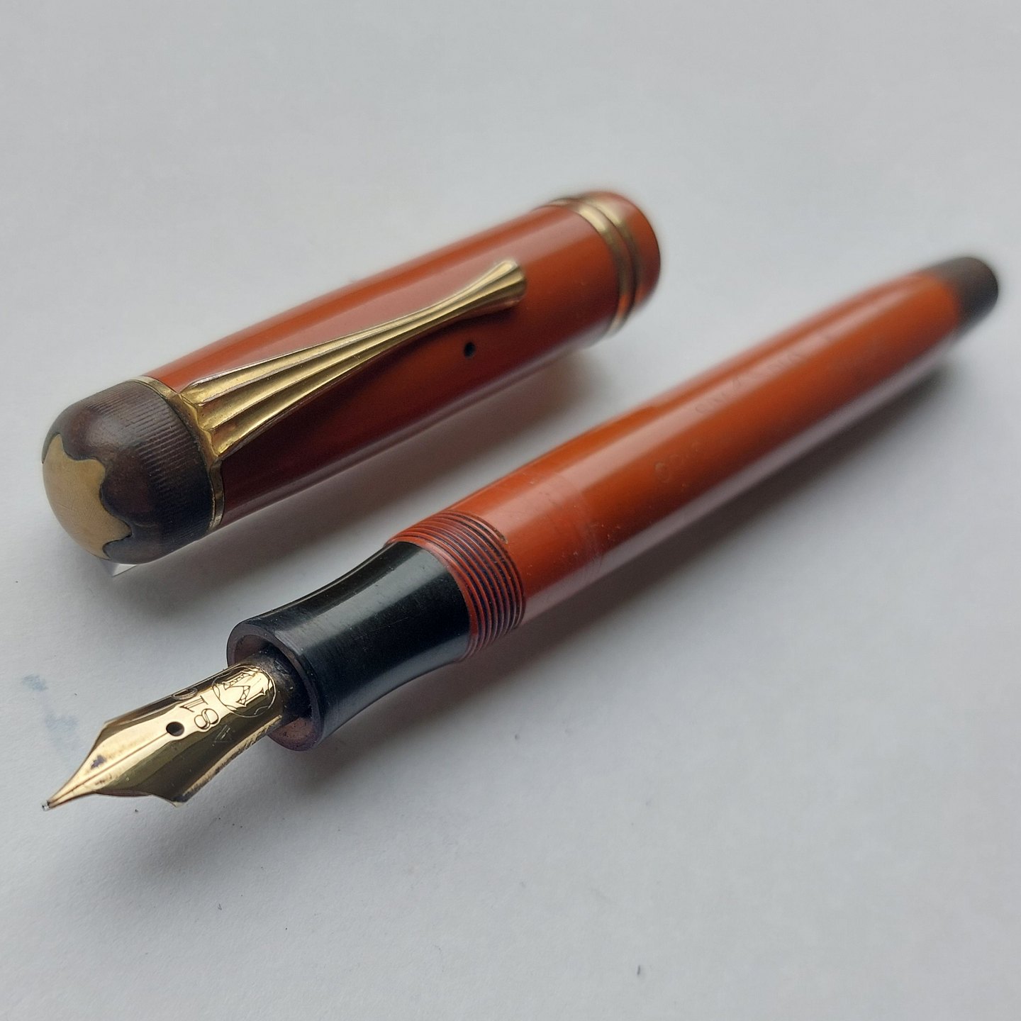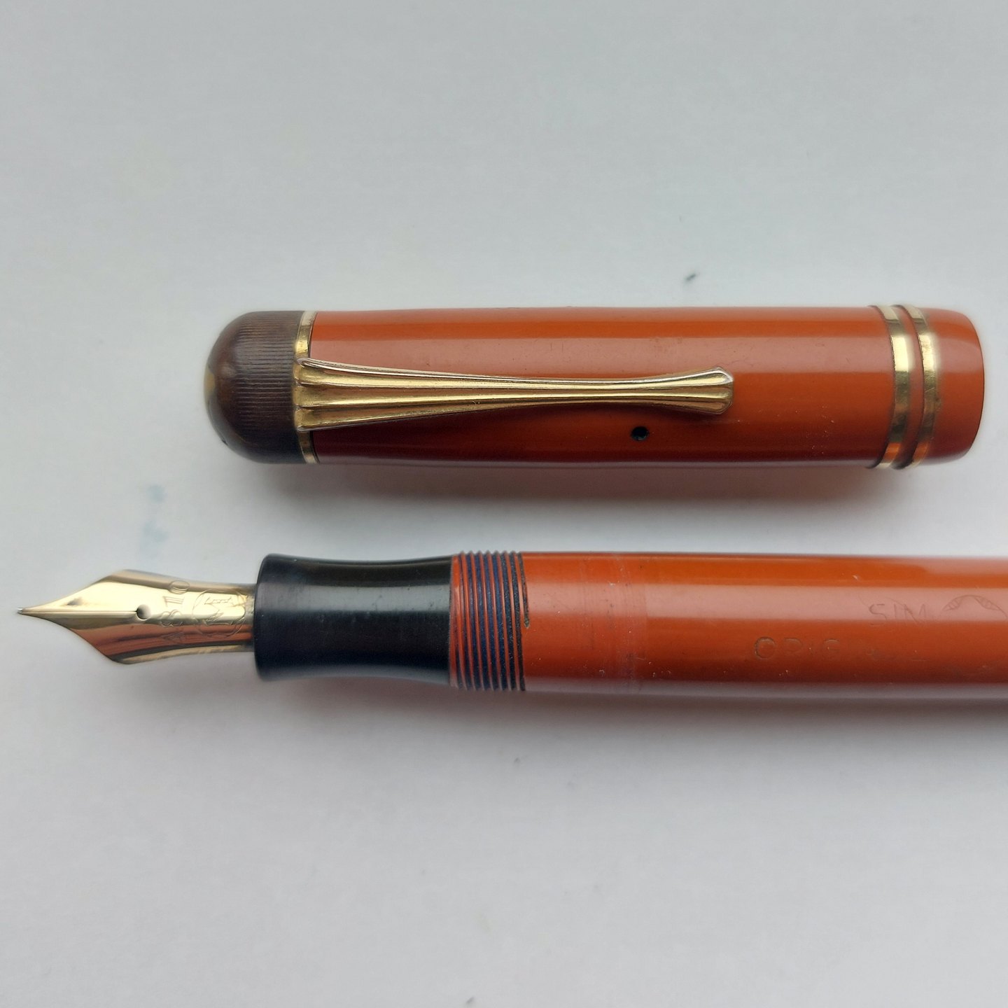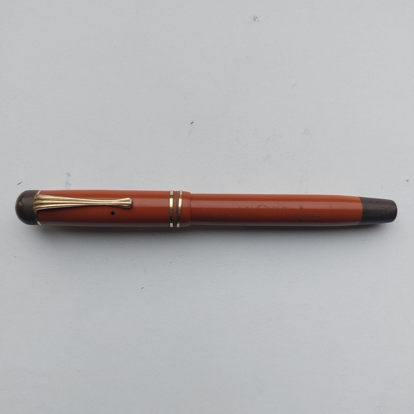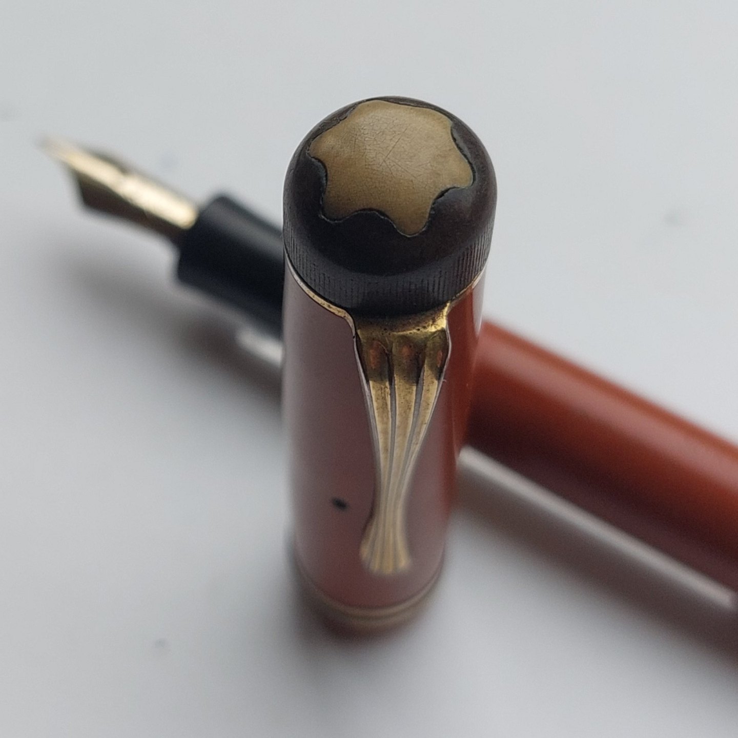 STOR HVID STJERNE: Koralrød Montblanc Masterpiece nr. 25 fyldepen. Fremstillet omkring 1940. I god stand uden skader eller reparationer. Alle dele originale Montblanc dele. Der skal indsættes ny gummisæk før end den fungerer igen. Dette kan indsættes ved et tillæg på kr. 250,- Mål: L. 13,5 cm