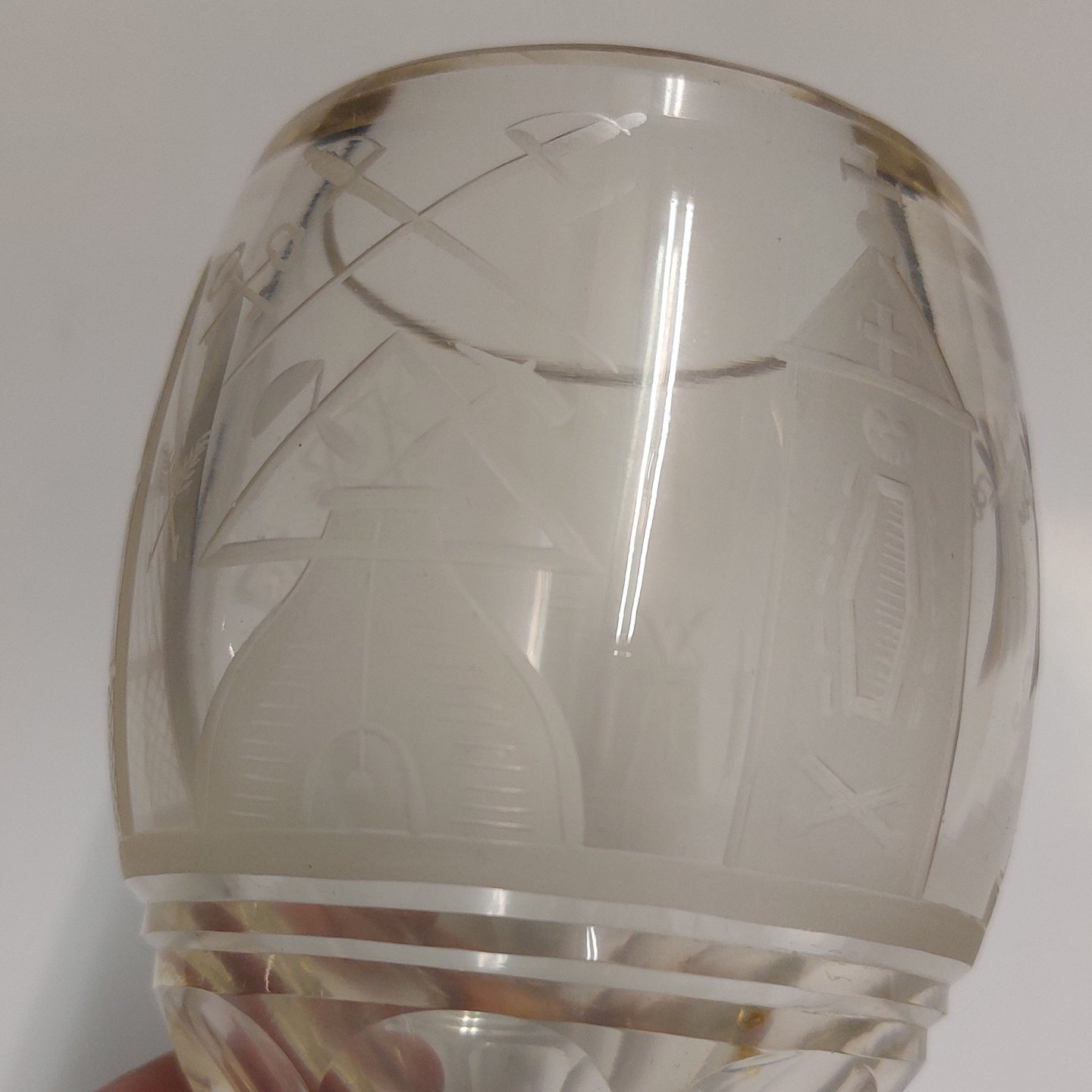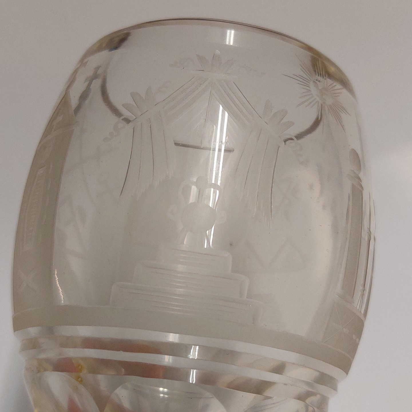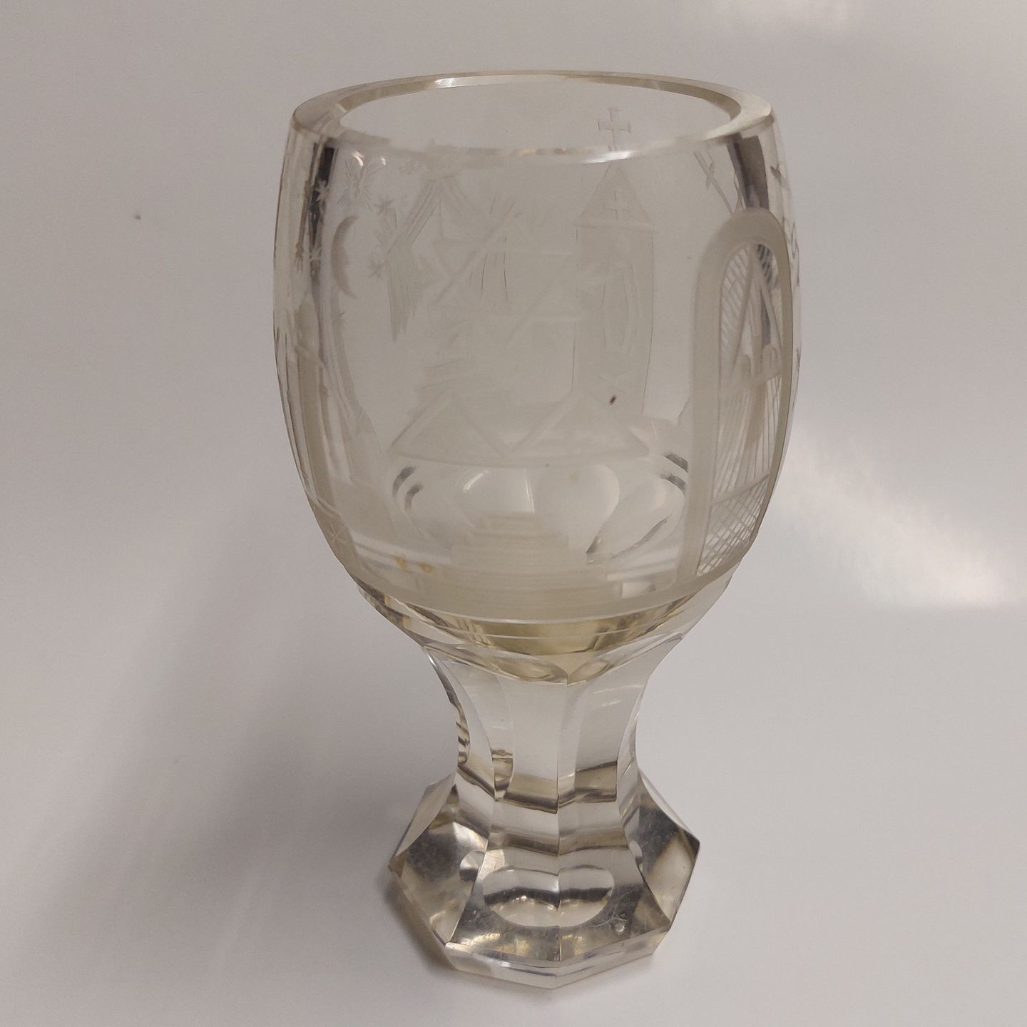 Kraftigt "Frimurer-glas" med slebne symboler. Fremstår i god stand uden skader eller reparationer. H. 15,5 cm