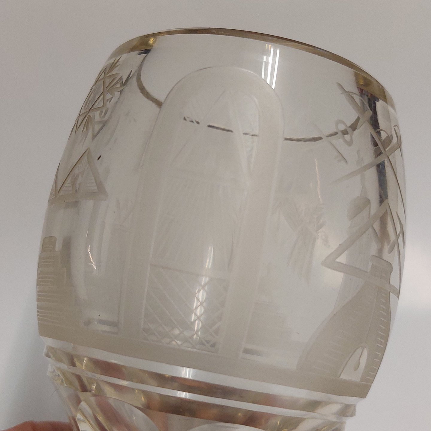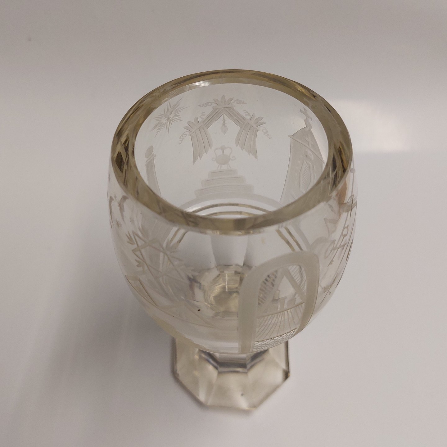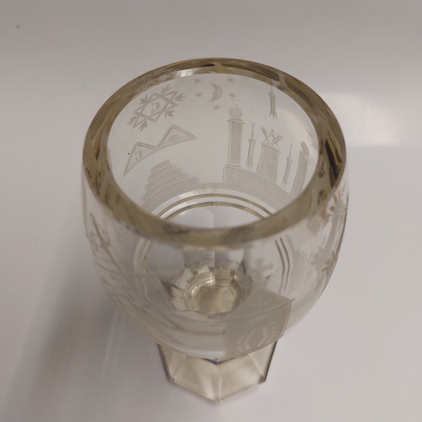 Kraftigt "Frimurer-glas" med slebne symboler. Fremstår i god stand uden skader eller reparationer. H. 15,5 cm