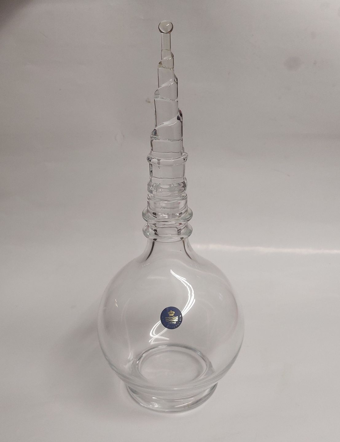 Karaffel i glss fra serien Byens Tårne, "Vor frelser Kirke". Rund kugleformet karaffel i glas med prop af "Vor Frelser Kirkes" spir. På siden ses Royal Copenhagens label,. H. 30 cm