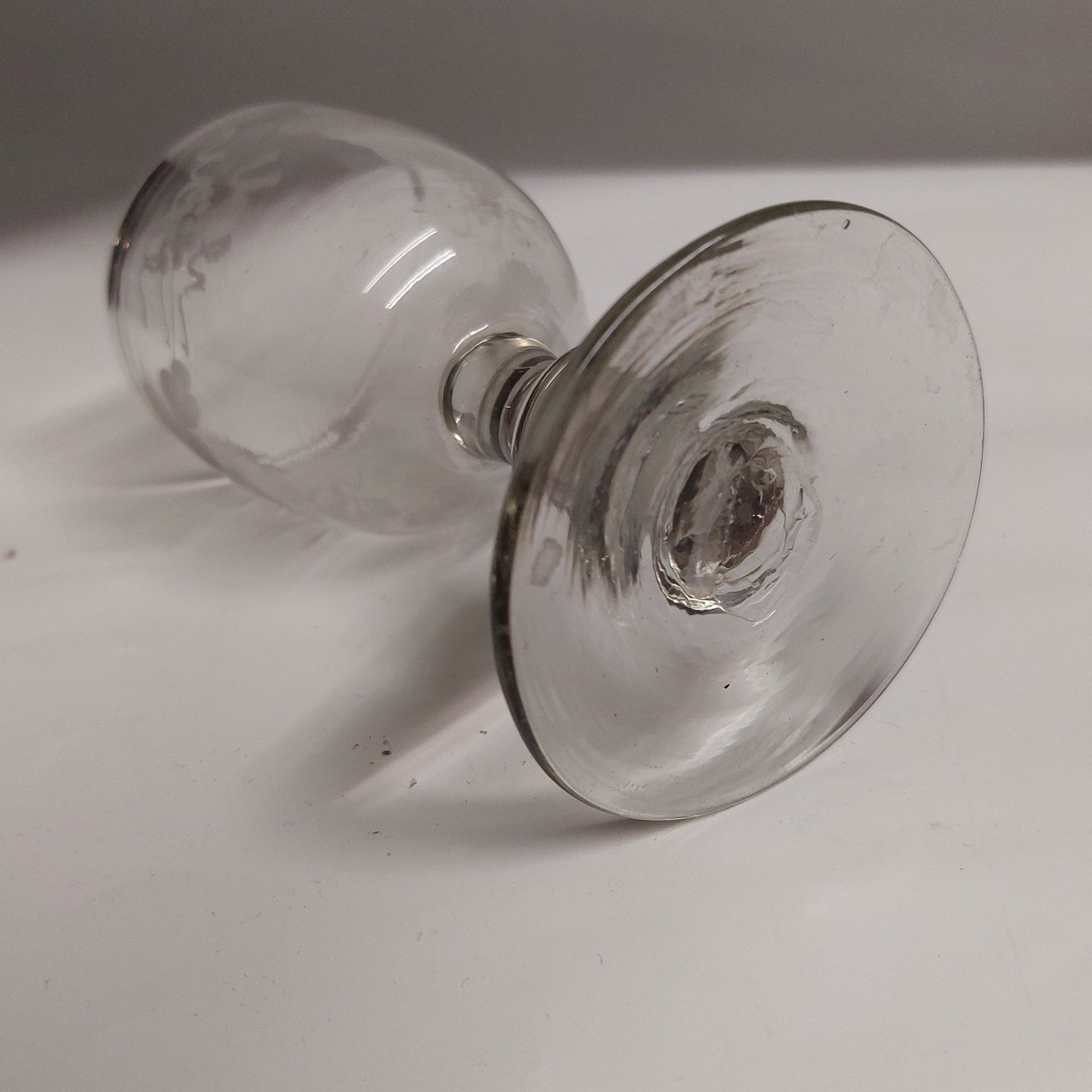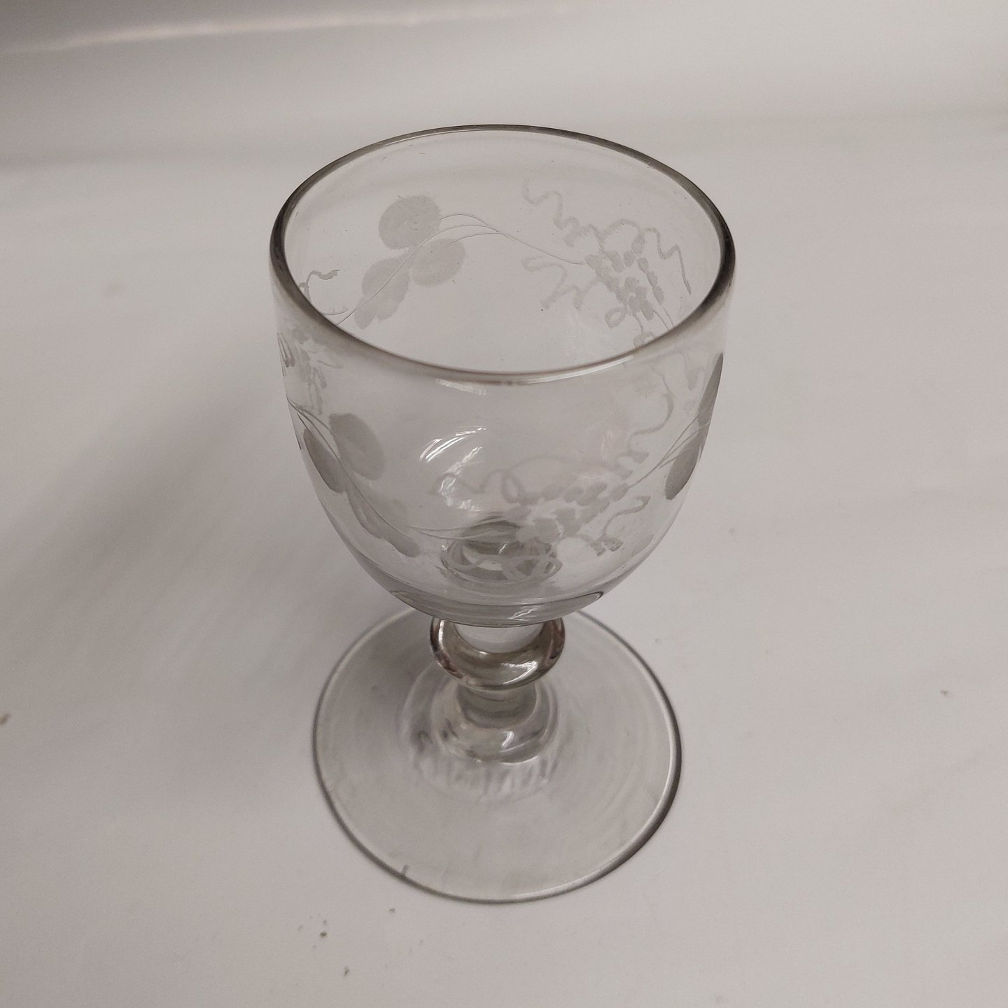 Vinglas fra Mylenberg Glasværk Ca. 1860. Dekoreret med slebet vinkøvsranke. Tre drueklaser og 3-delt blade. Grålig sats. Fremstår i god stand uden skader eller reparationer. H. 10,8 cm