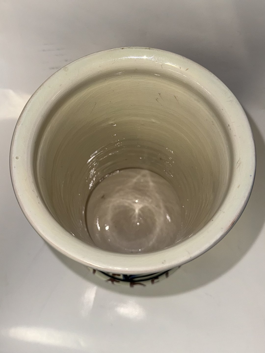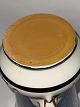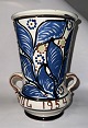 Vase med hankene keramik fra Kähler fabrikken med påskrevet tekst: GLÆDELIG på forsiden og JUL 1954 på bagsiden. Har et par små overflade skrammer (se foto). Ingen alvorlige skader og ingen reparationer. Fabriksmærket på bunden. H. 21,5 cm