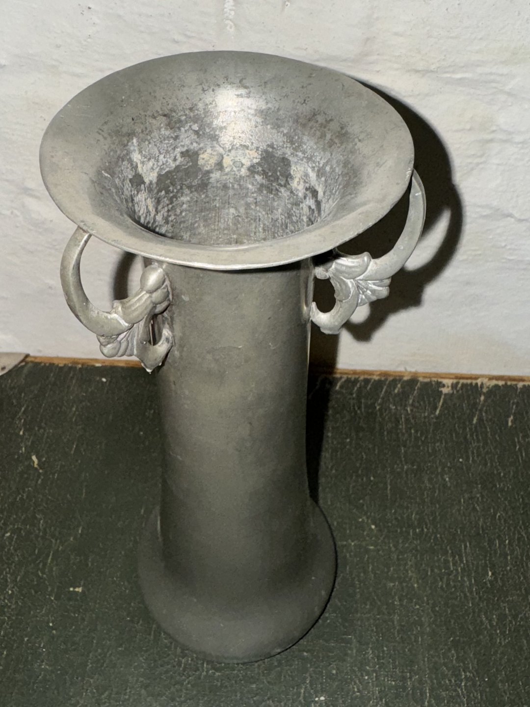 Vase med hanke i tin. Fremstillet hos Mogens Ballin omkring 1900. Ingos stand. Fabeiksmærket på bunden. H. 24 cm