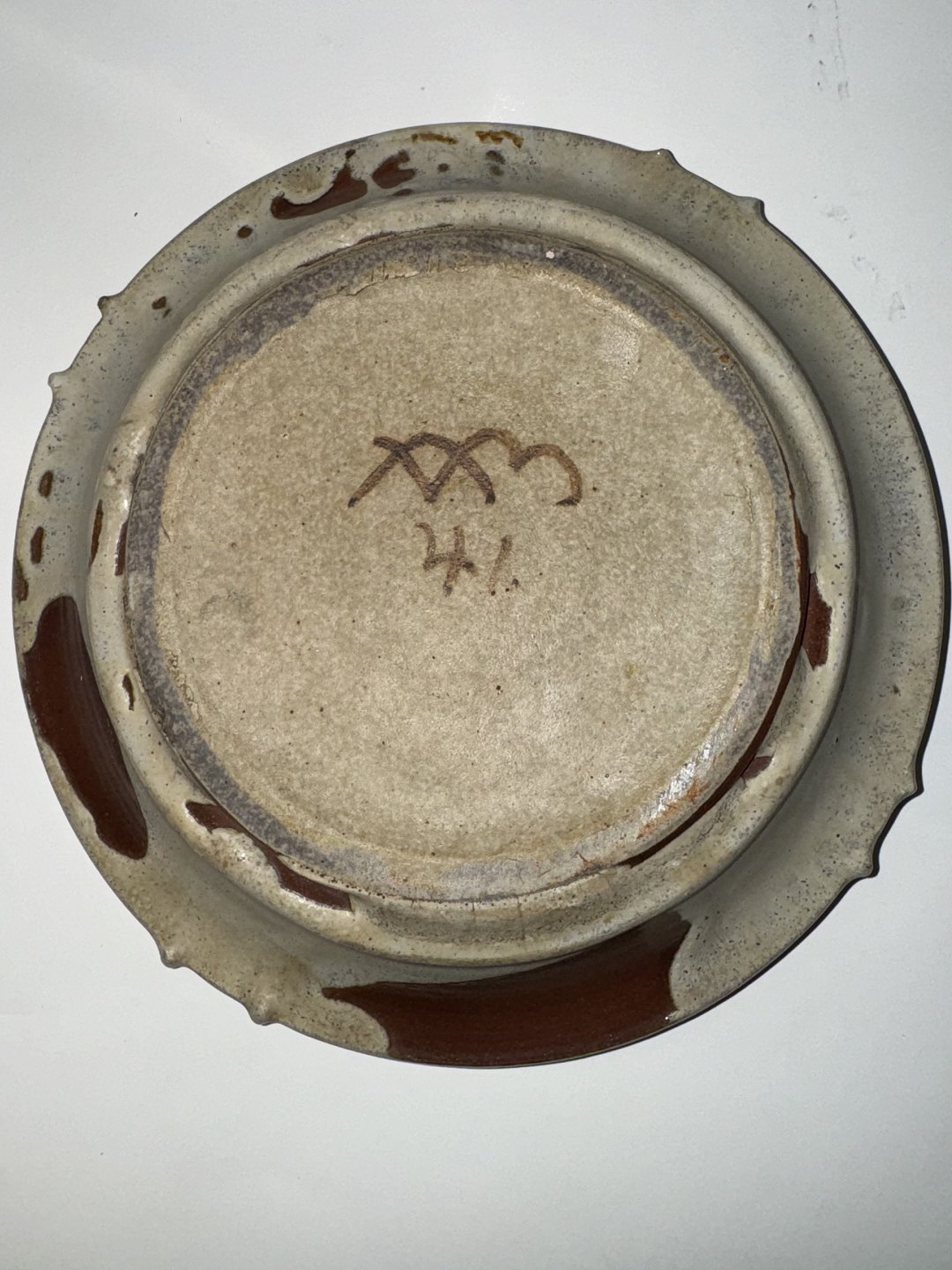 Rundt fad i keramik. Dekoreret med muslinger og ribber. Sparsomt glaseret på undersiden. Fremstillet på Arne Bang’s værksted omkring 1940. Signeret af kunstneren på undersiden. Fremstår i god stand. Mål: H. 4 cm samt diameter på 17,5 cm i diameter.