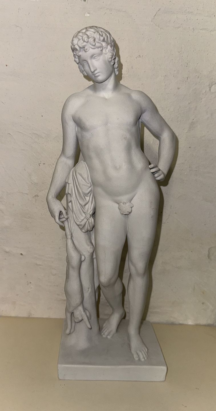 Figure in bisquit porcelain by Adonis. After statue modeled by Bertel Thorvaldsen (1770-1844) in Rome in 1808. Made at Royal Copenhagen in the late 19th century. Minor repair on the hare's ear. The factory mark on the bottom. H. 32 cm