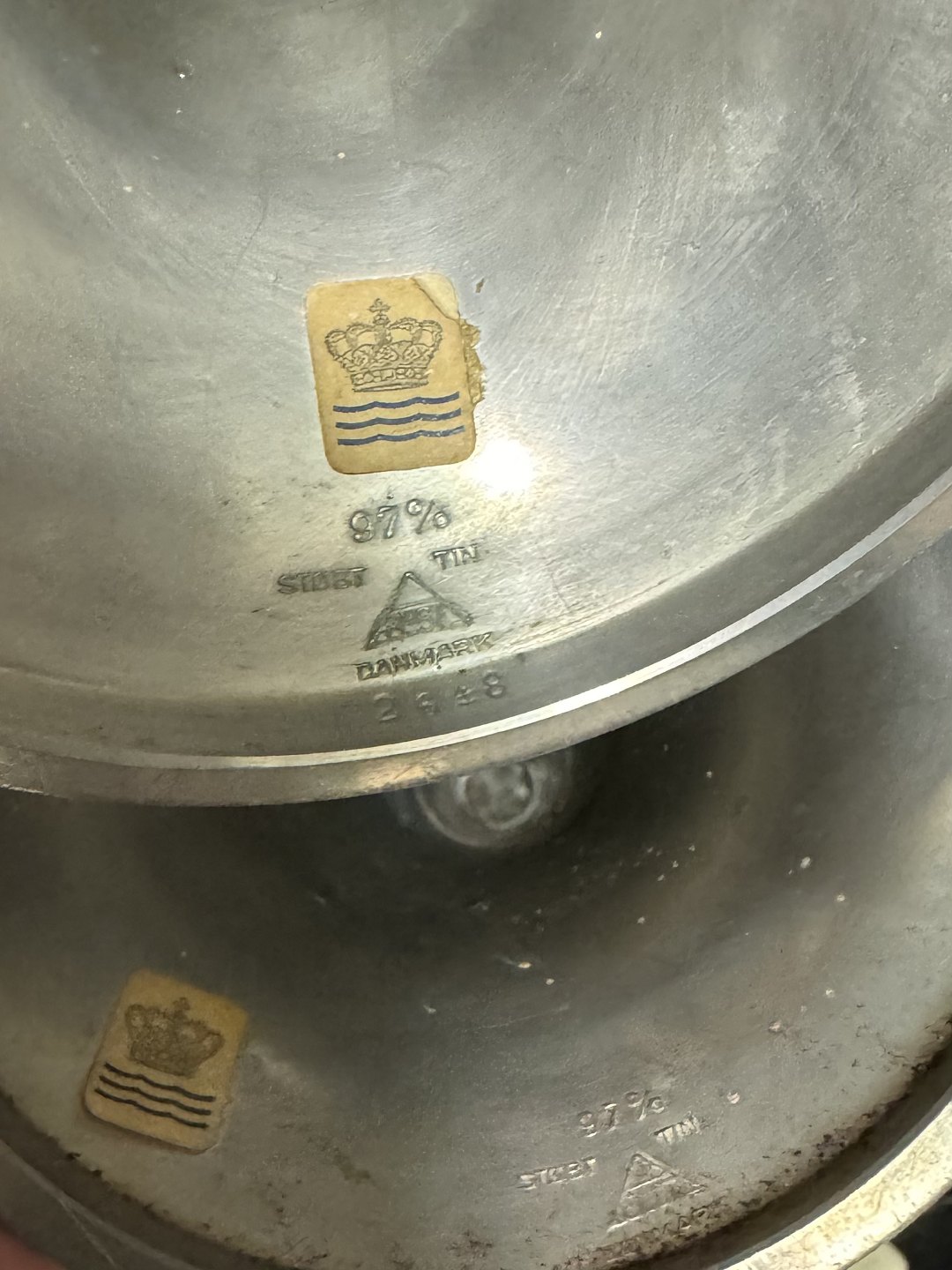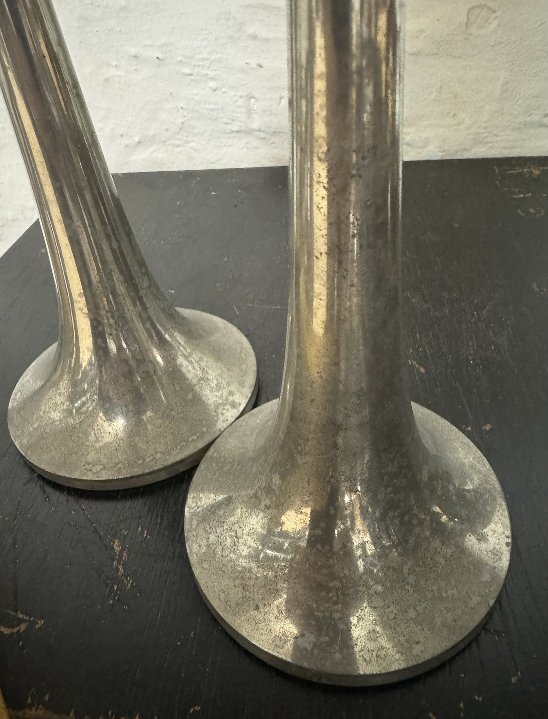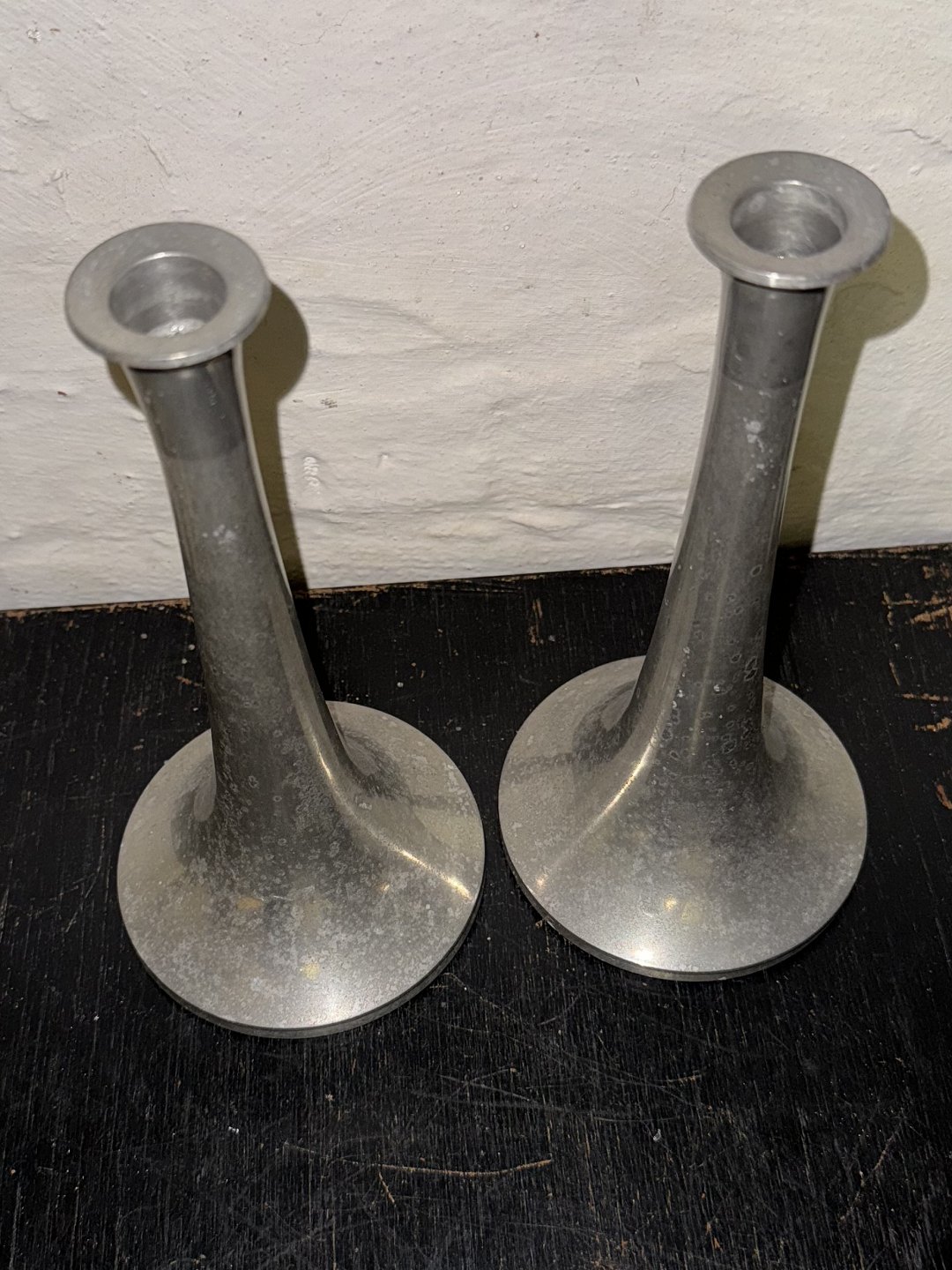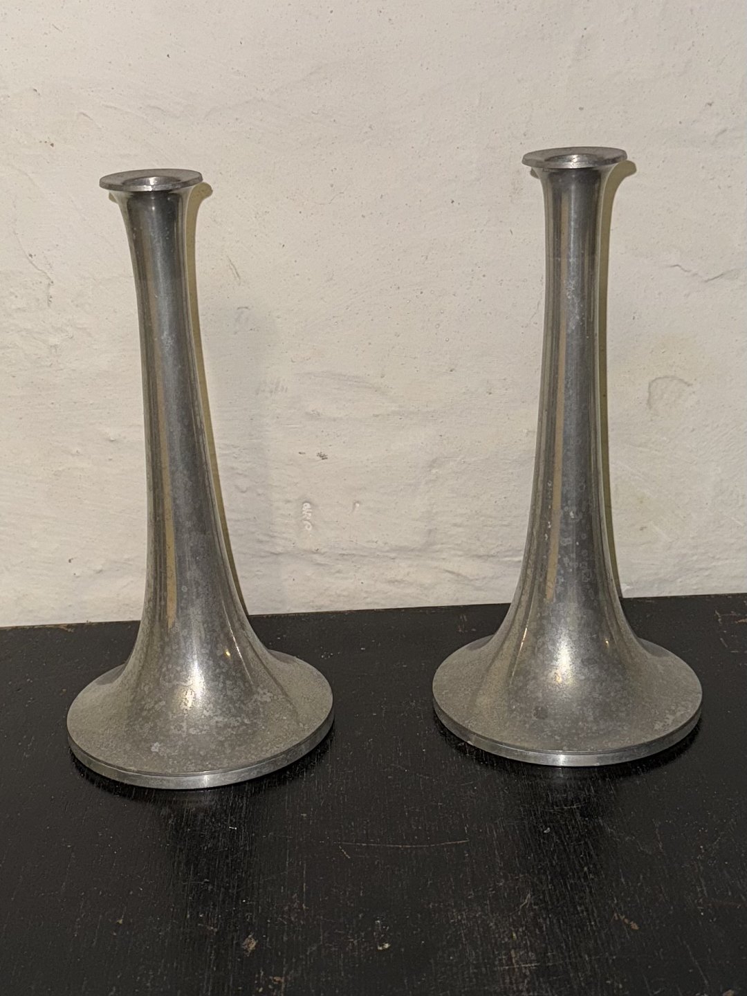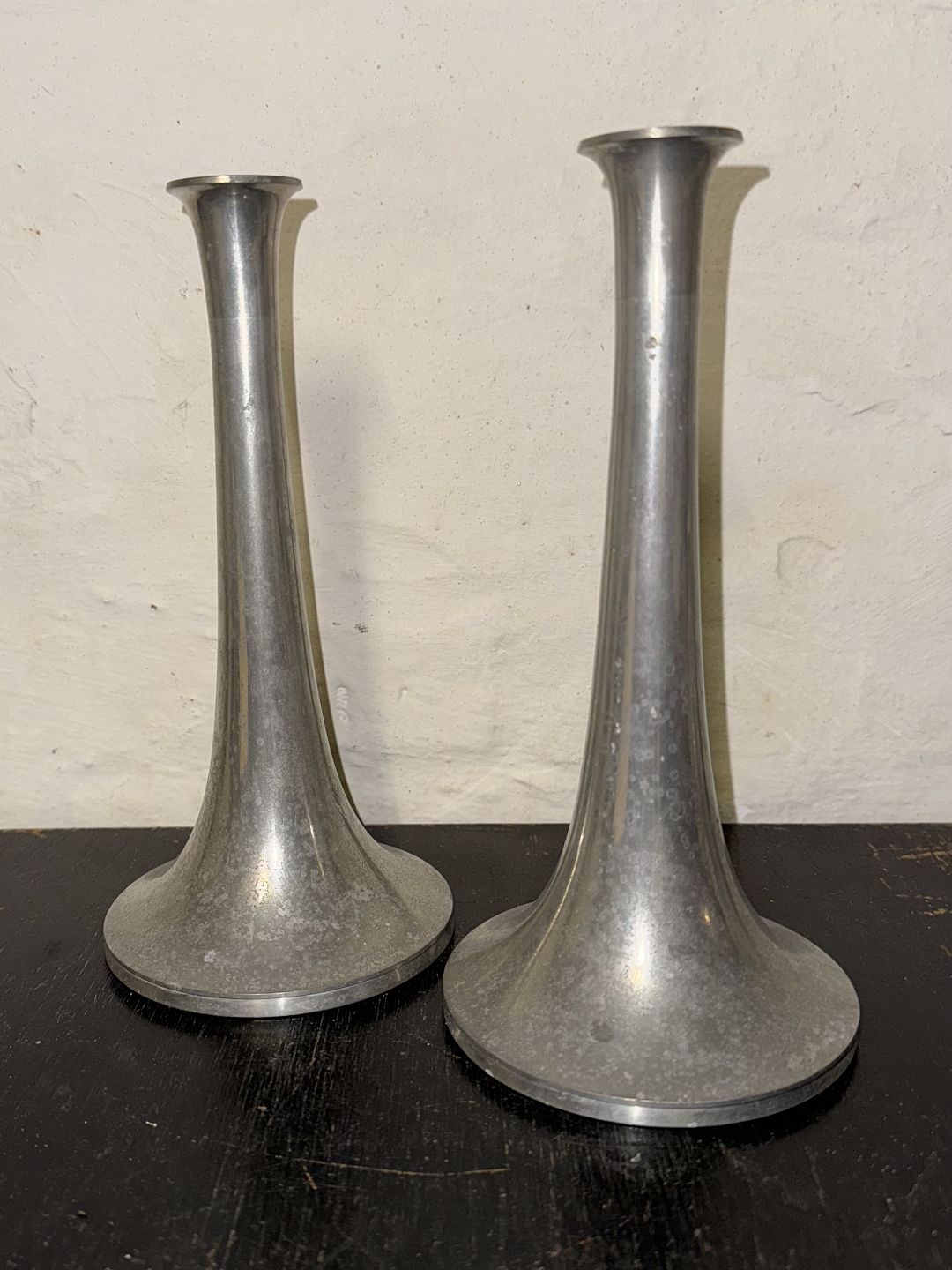 Par trompet-formede lysestager i tin fra Just Andersen fabrikken. Danmark i 1950’erne. Overfladen anløbet. Ellers intet at bemærke. Fabriksmærkede på bunden. H. 22 cm