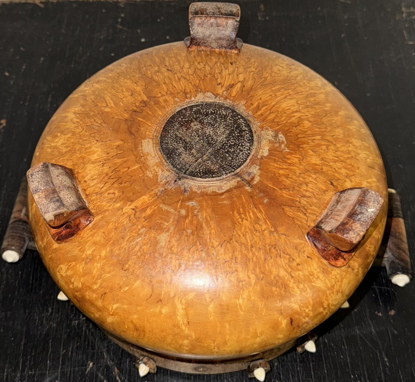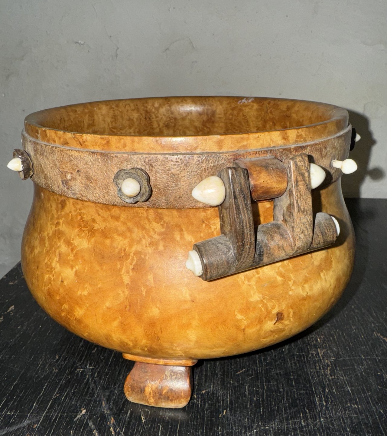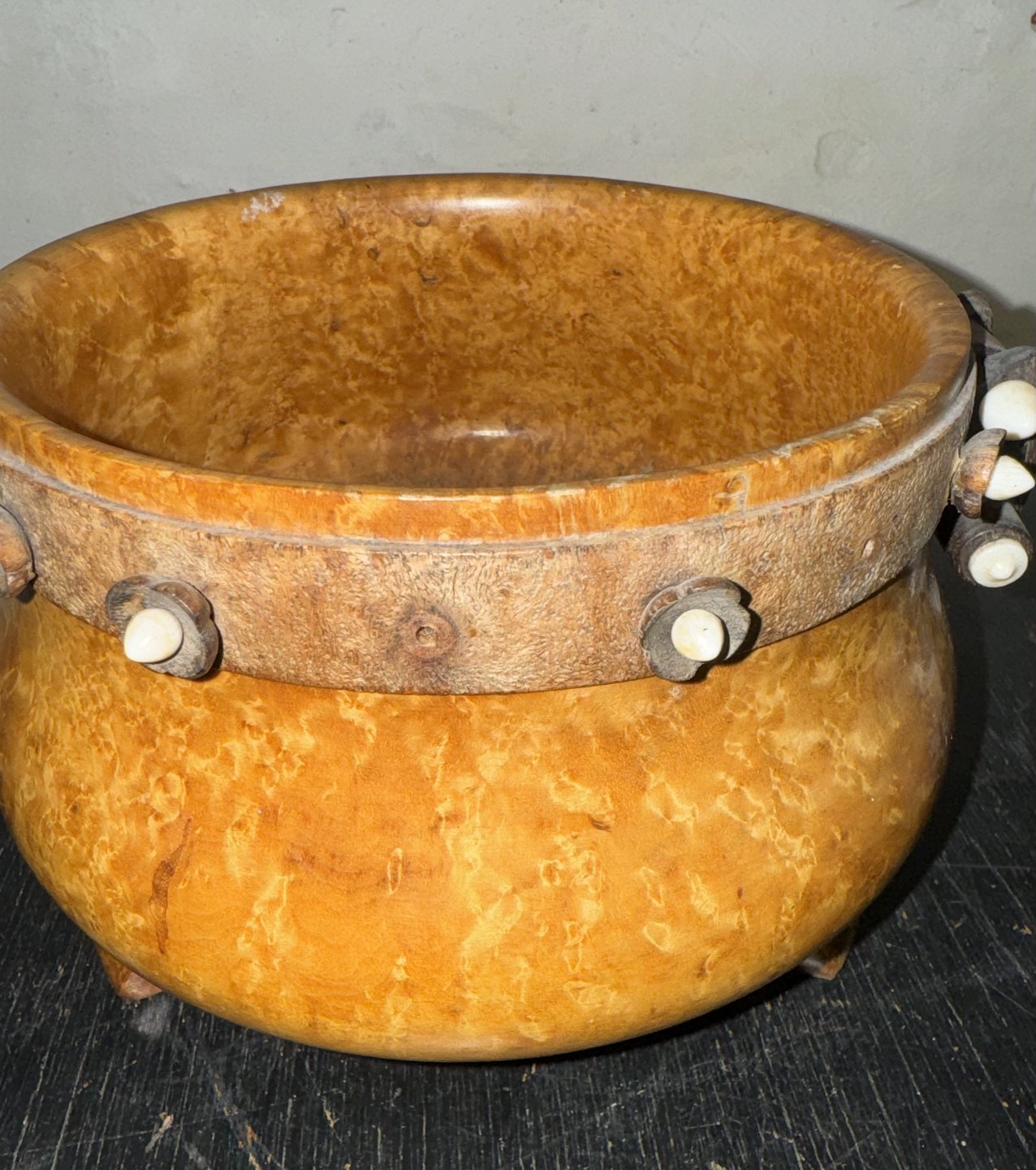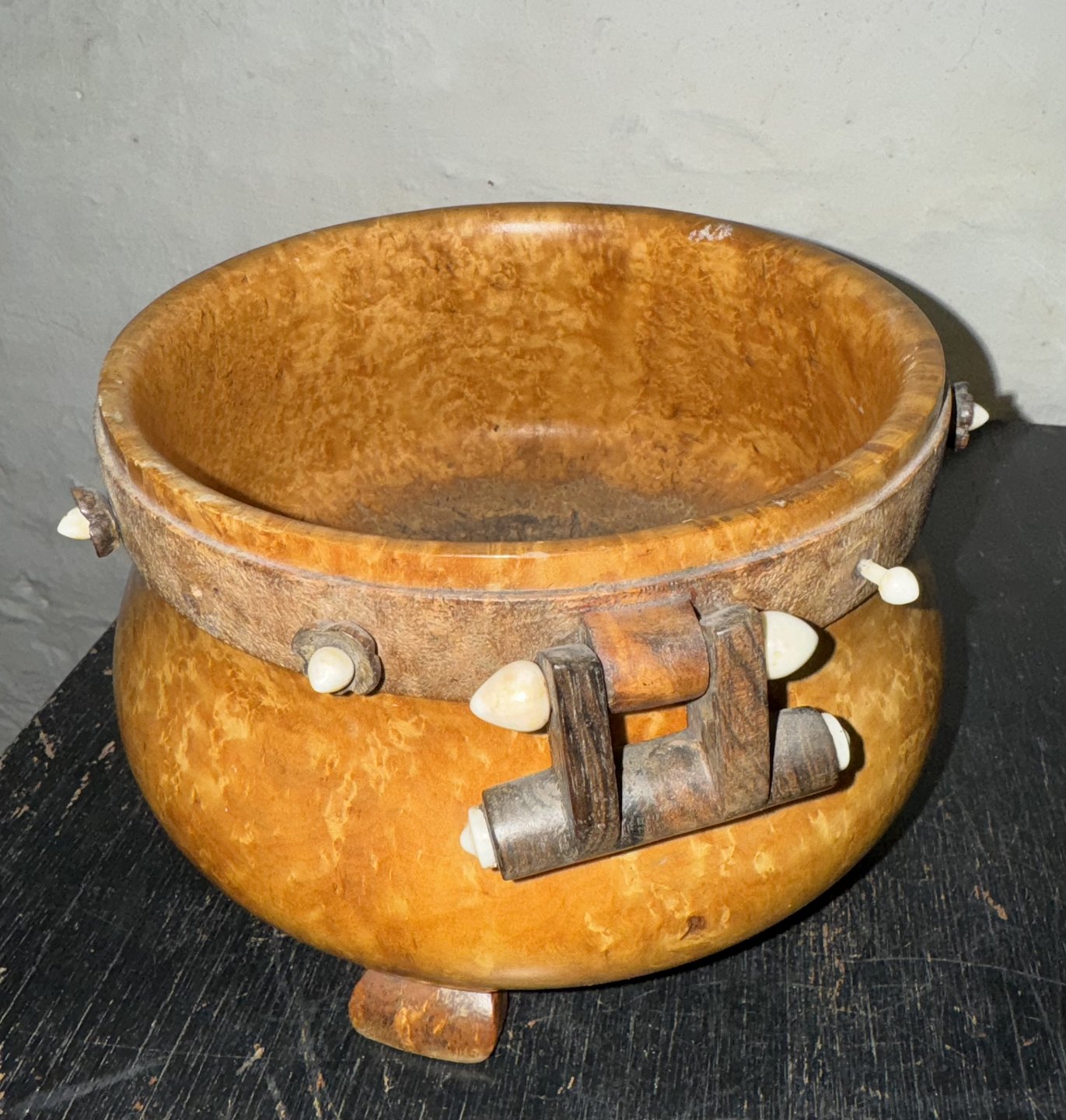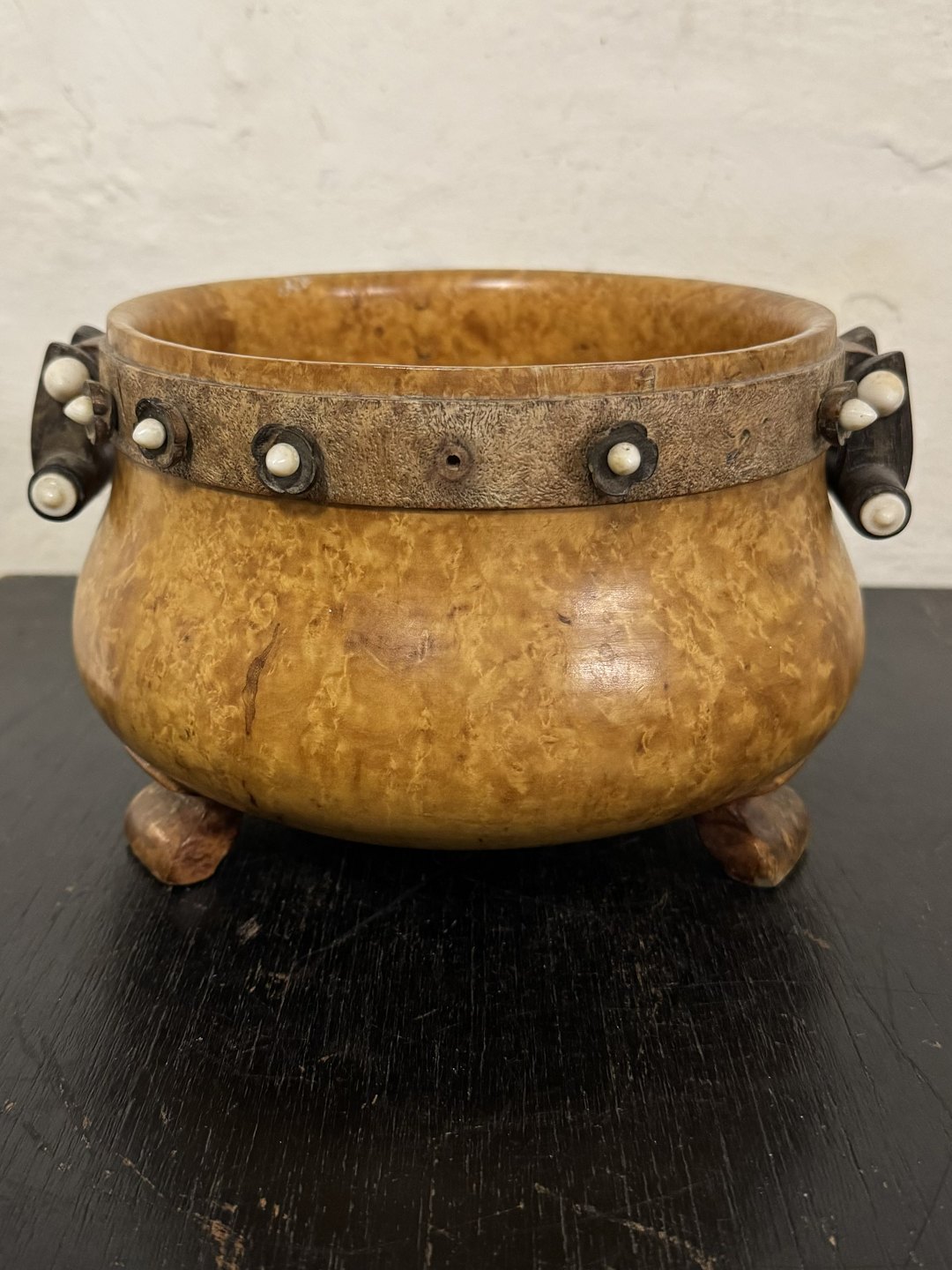 Skål på tre ben i Masur Birk. Formodes fremstillet i Norge i 19. århundrede. Dekoreret med hank samt med ben-perler som blomster rund i kanten. Flere dog forsvundet. Alderrelateret brugsspor. Bl.a. revner i bunden af skålen. Har sikkert været et kært brugsobjekt i generationer. Mål:H. 12,3 cm Ø. 16,5 cm