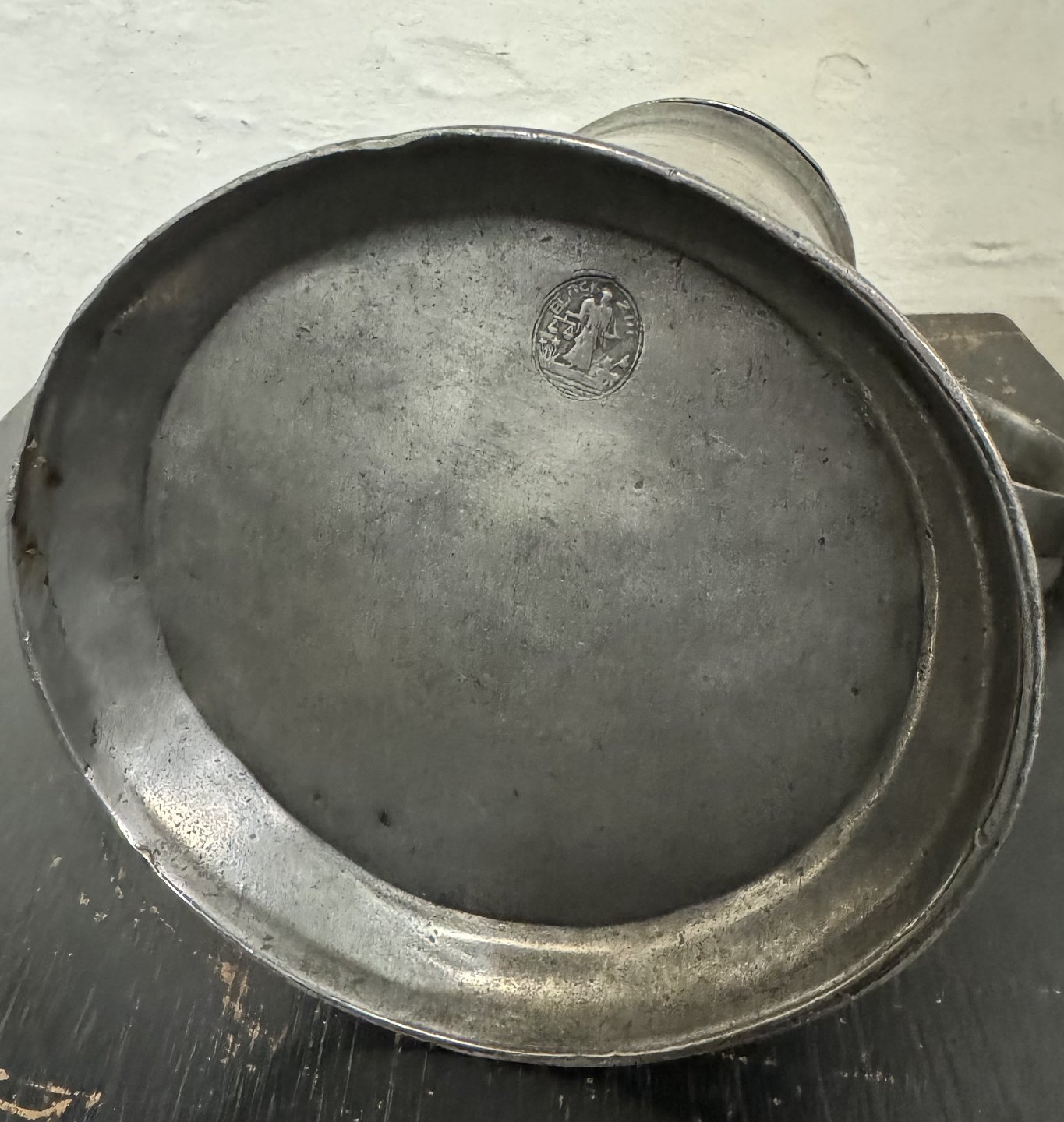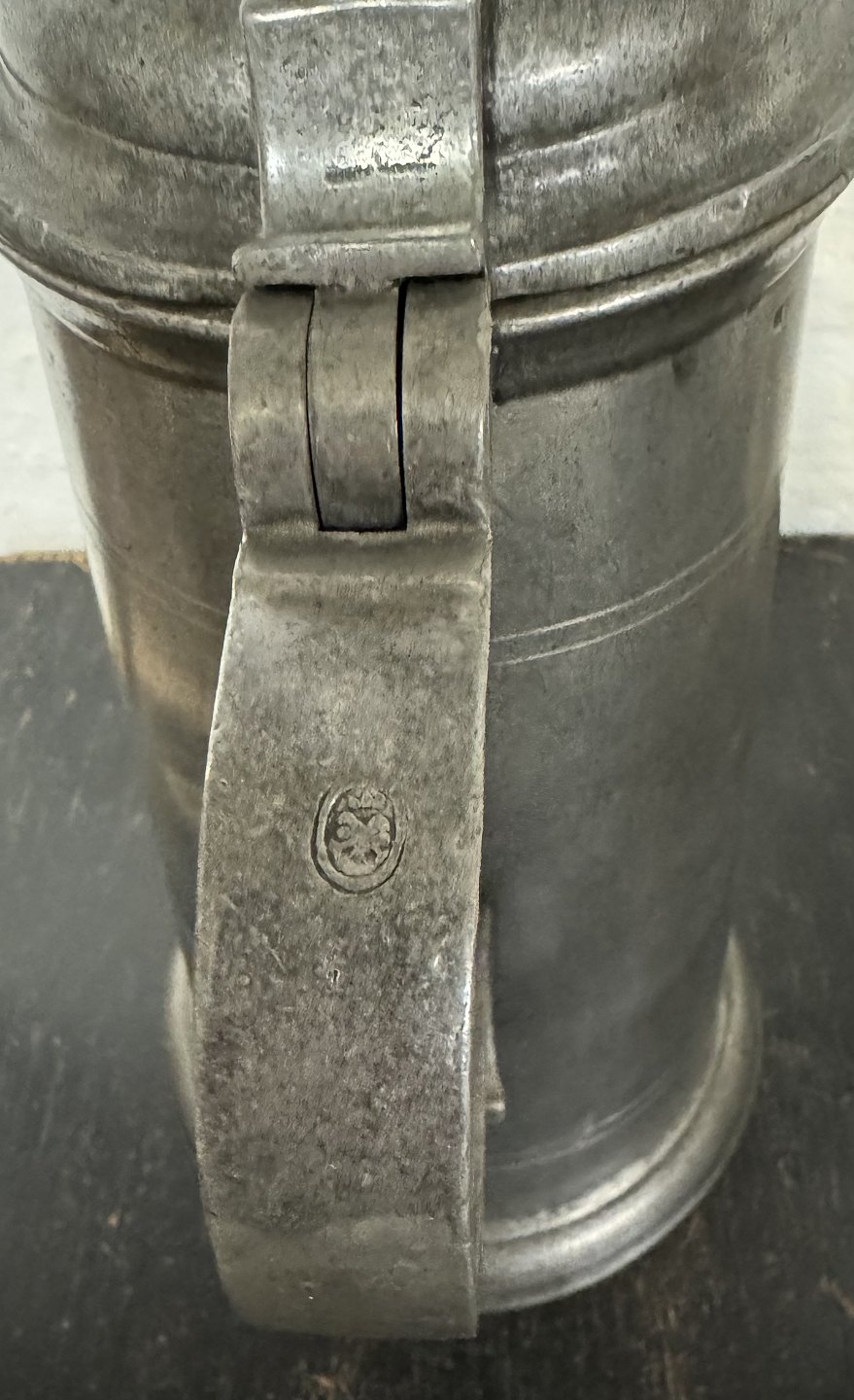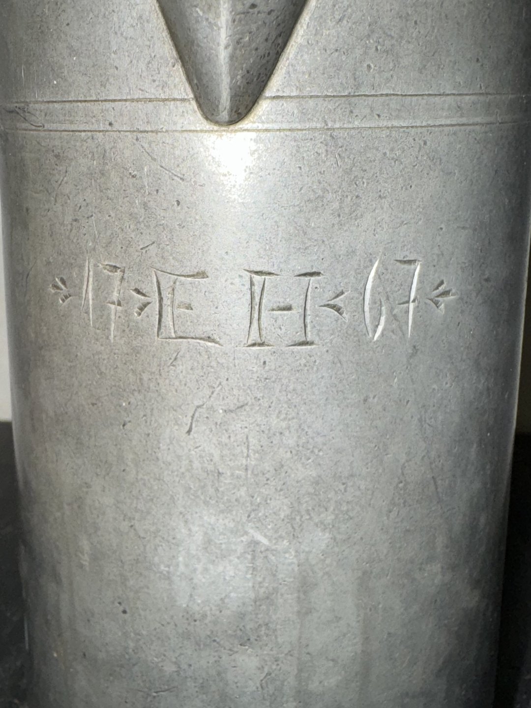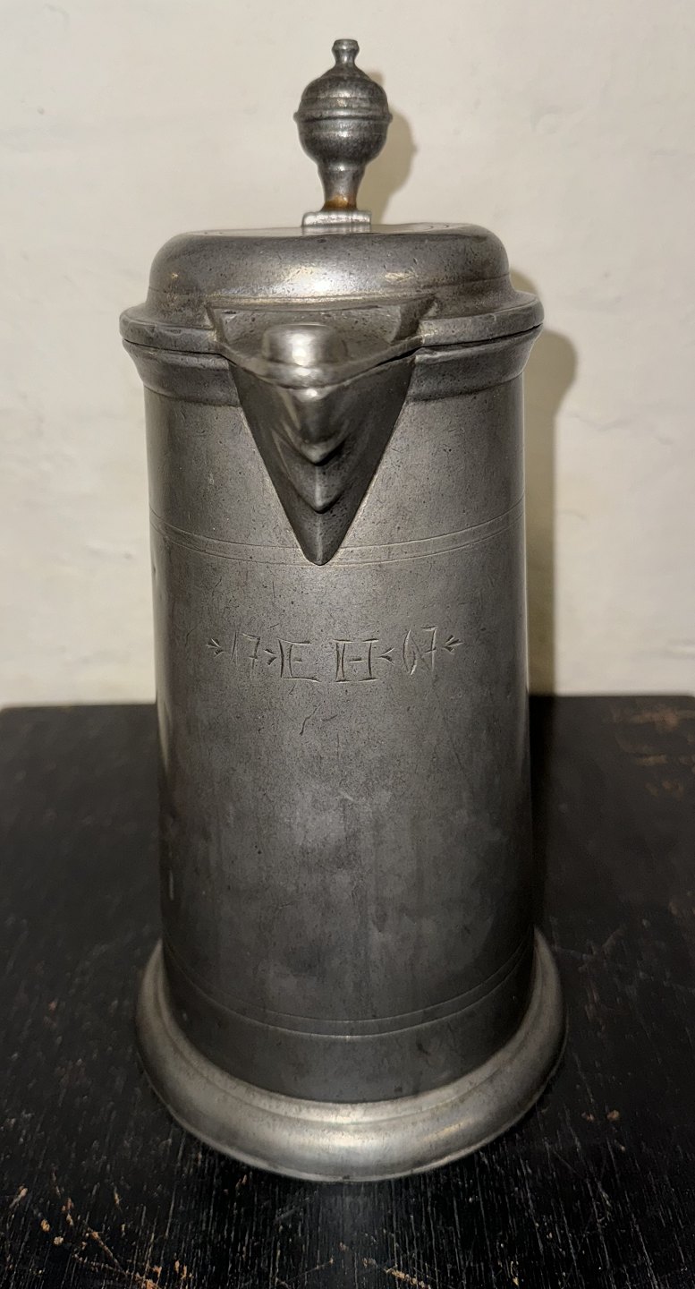 Større kande med låg i tin. Stemplet med tyske mærker på hanken samt på bunden. Indgravering på forsiden med 17EH67. Fremstår i god stand. H. 30 cm. Bundens diameter er 15,5 cm