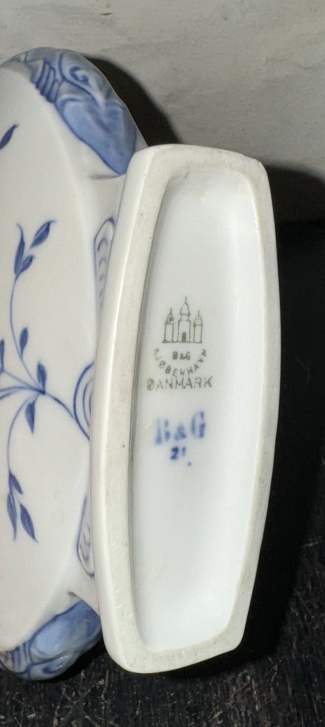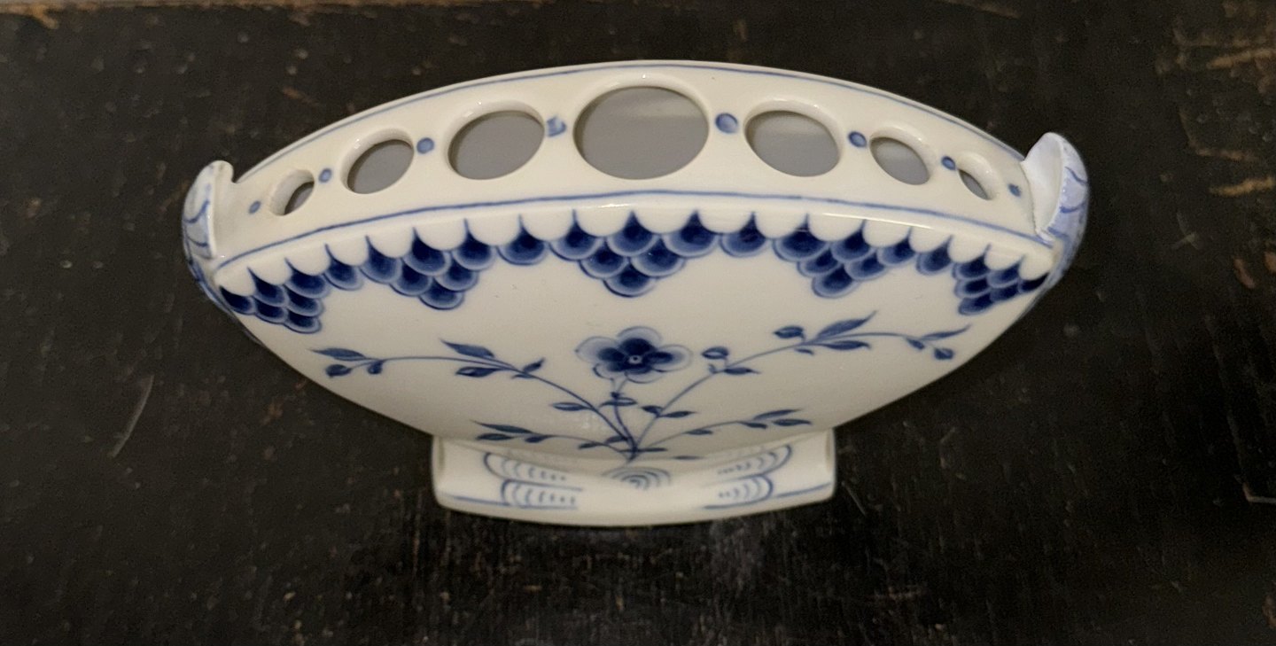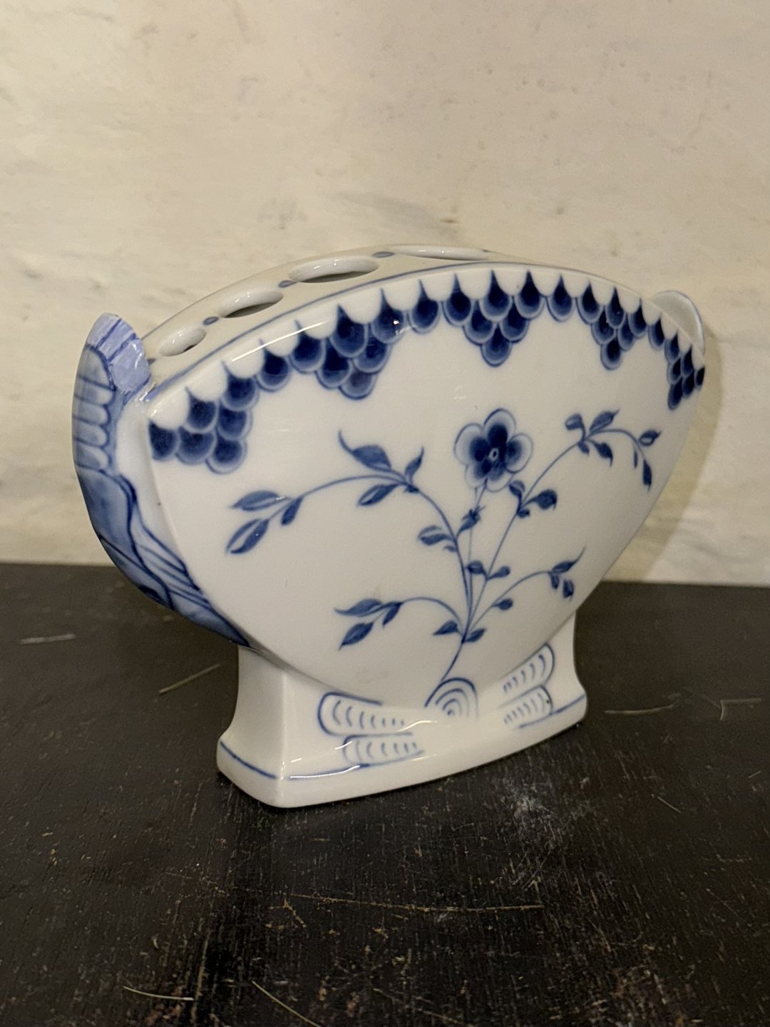 Sommerfugle stellet: Blåmalet viftevase: Blomster og musselmalet. blomsterholder fra Bing & Grøndahl i porcelæn. I god stand. Fabriksmærket på bunden. Mål: H. 11,5 cm L. 16 cm.