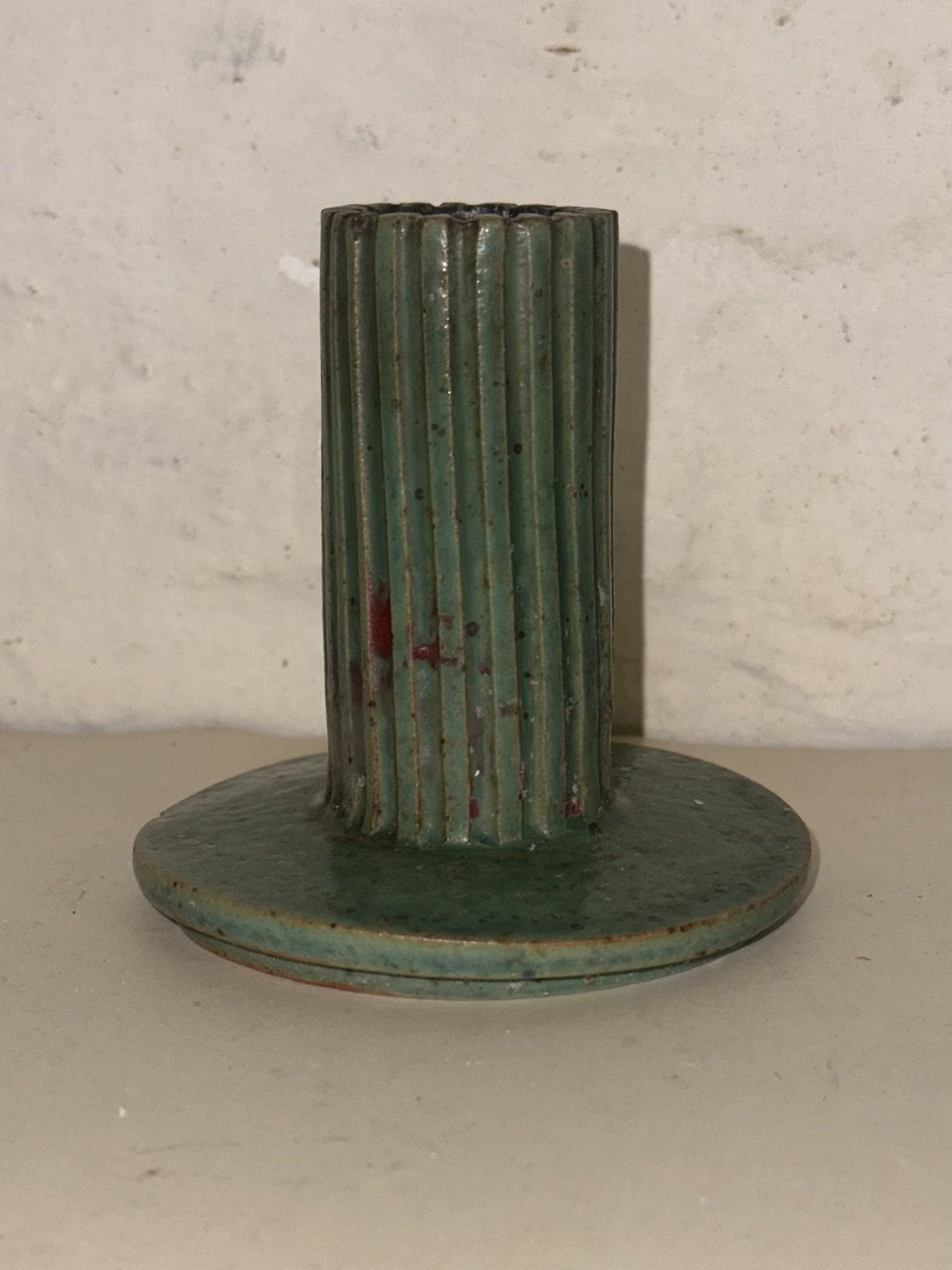 Ceramic candlestick with grooved candle tube. In good condition. Covered in green glaze. Signs of wear inside. Inscribed AB on the underside along with model number 133. H. 9.2 cm