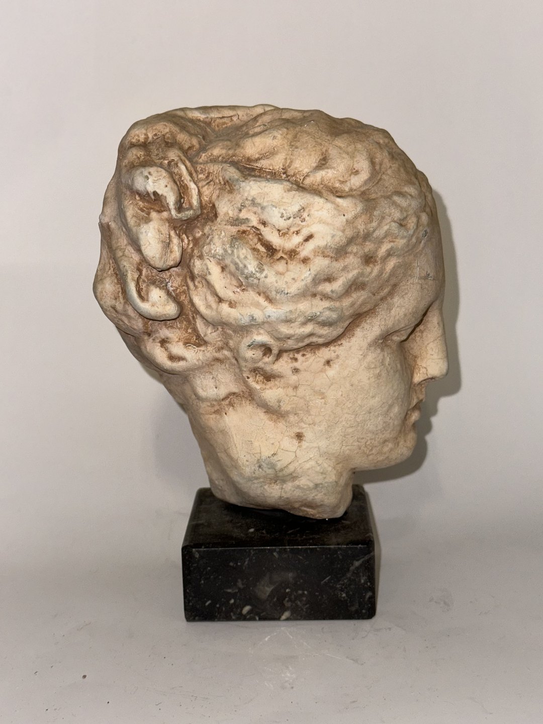 Skulptur i gips på sort sokkel. Forestillende Hygieia, der er den græske gudinde for sundhed, hygiejne og renlighed. Hygieia er datter af guden for medicin Asklepios.