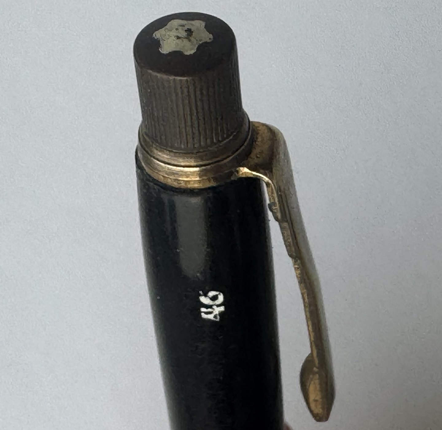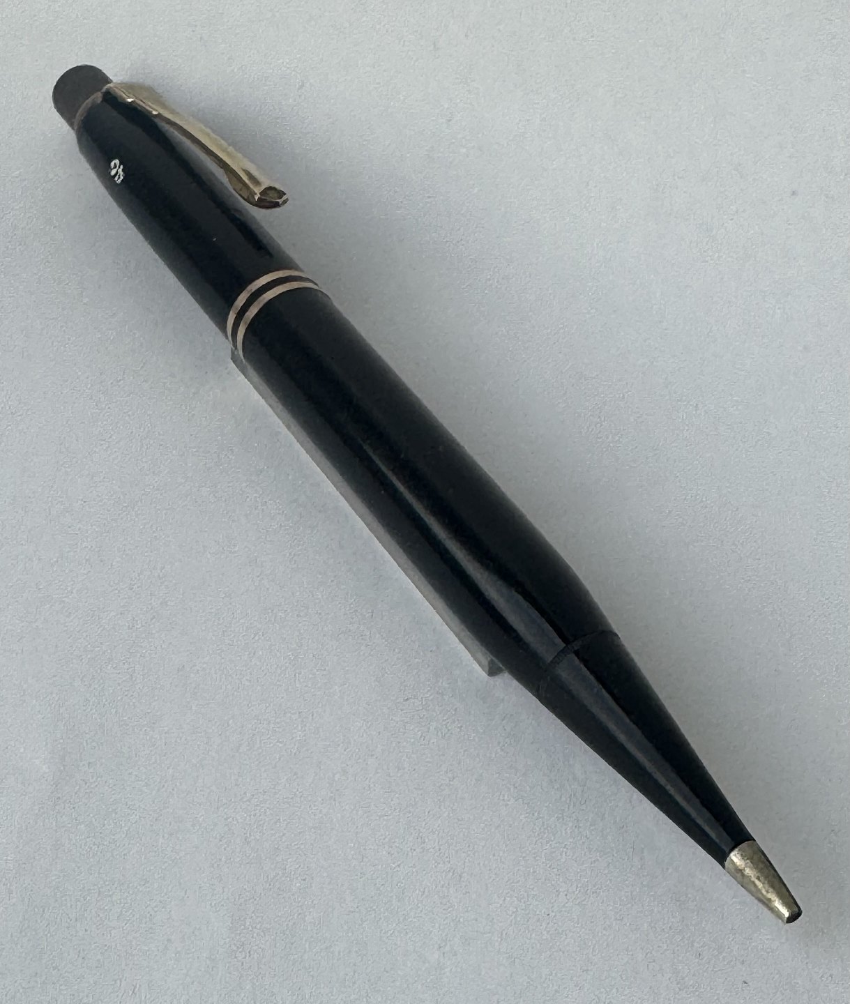 Sort Montblanc no. 46 stiftblyant. Fremstillet i Tyskland i 1950’erne. I god stand. Klar til at blive brugt. Der skal dog tilkøbes Bly-stifter før end den igen er skrivedygtig.