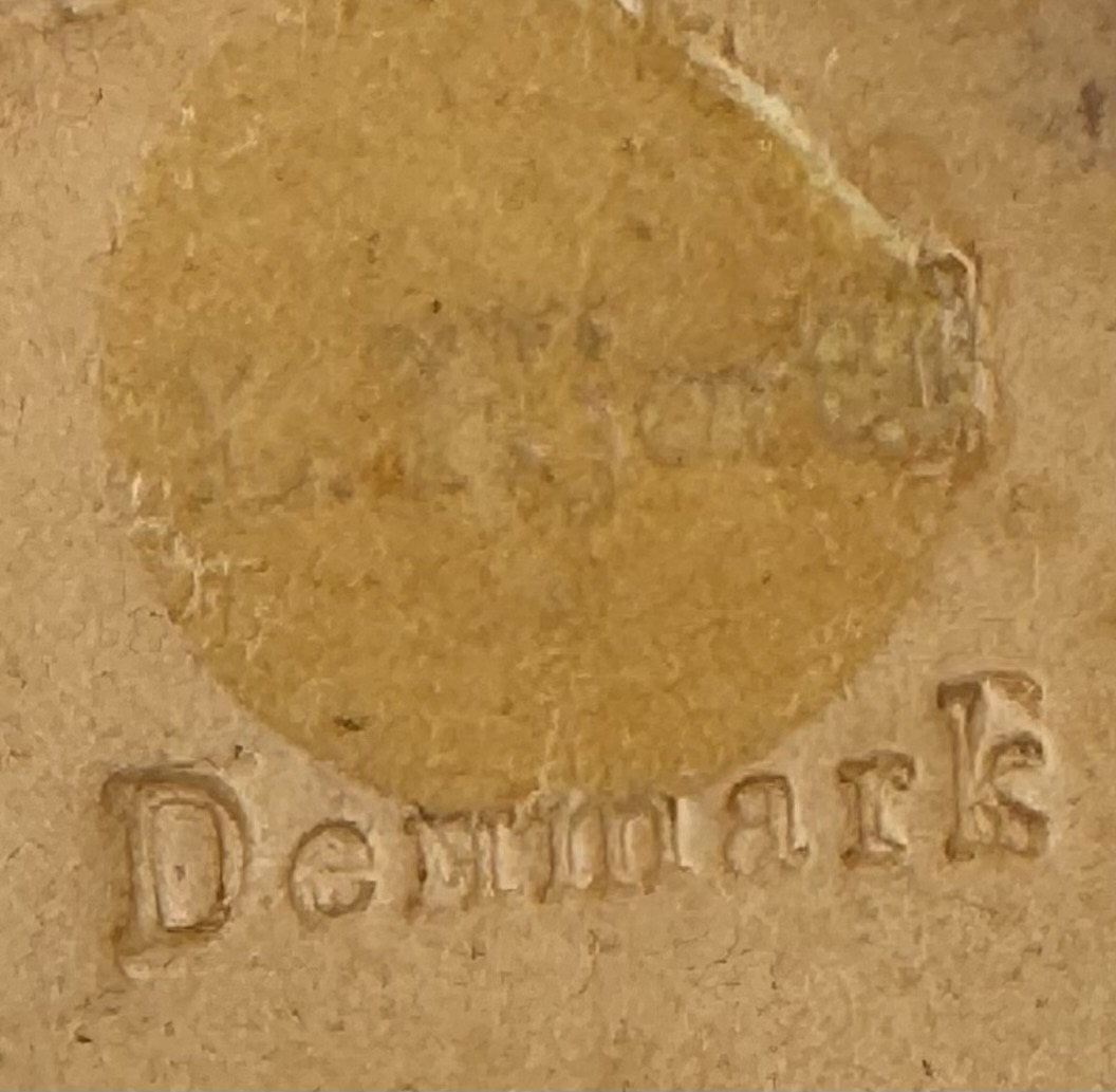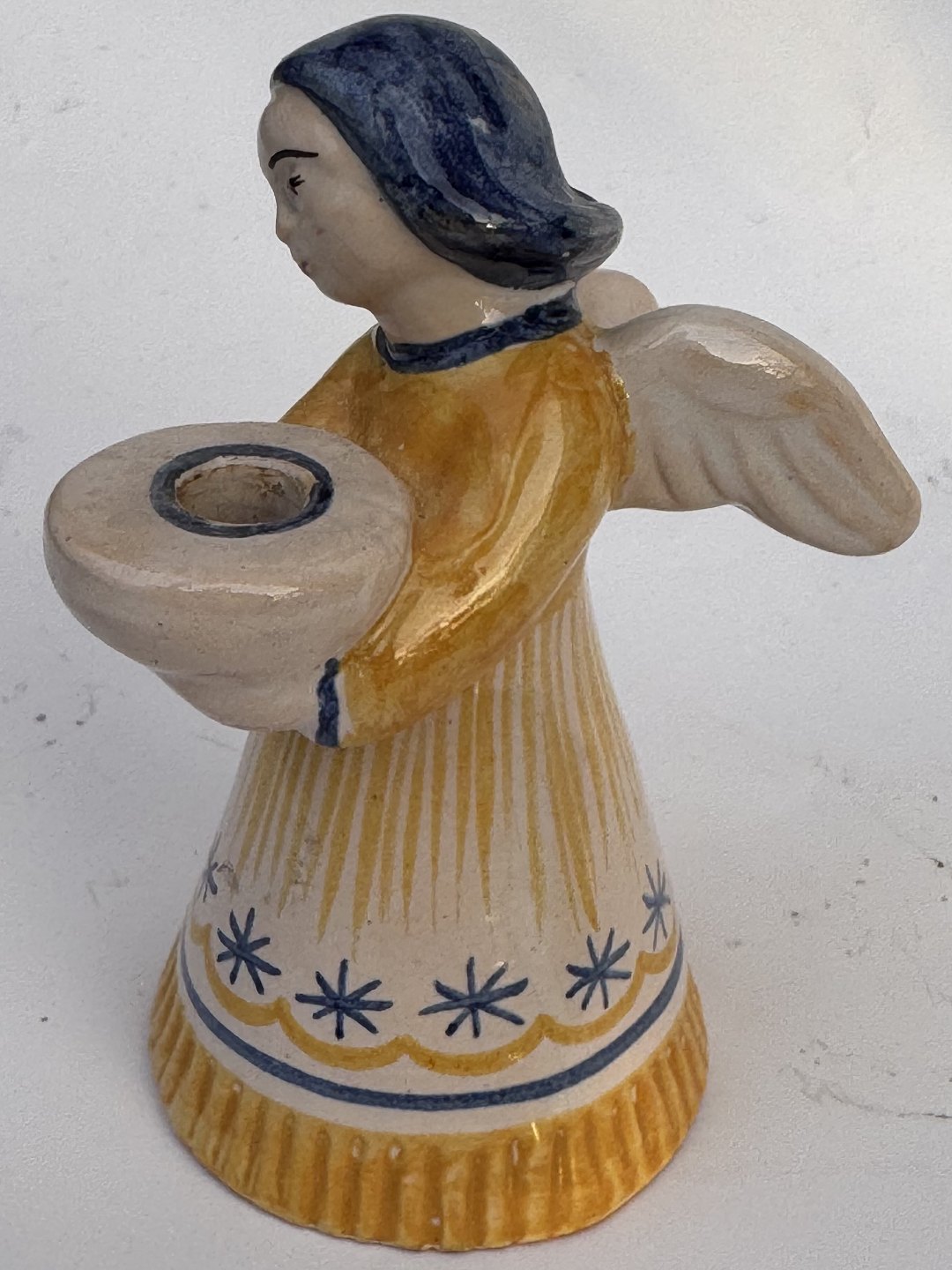 ENGEL I GUL KJOLE: Figur af bemalet engel i keramik som lyseholder fra den bornholmske lervarefabrik Lauritz Hjorth. Fremstår i god stand uden skader eller reparationer. Fabriksmærket på bunden. H. 9,5 cm