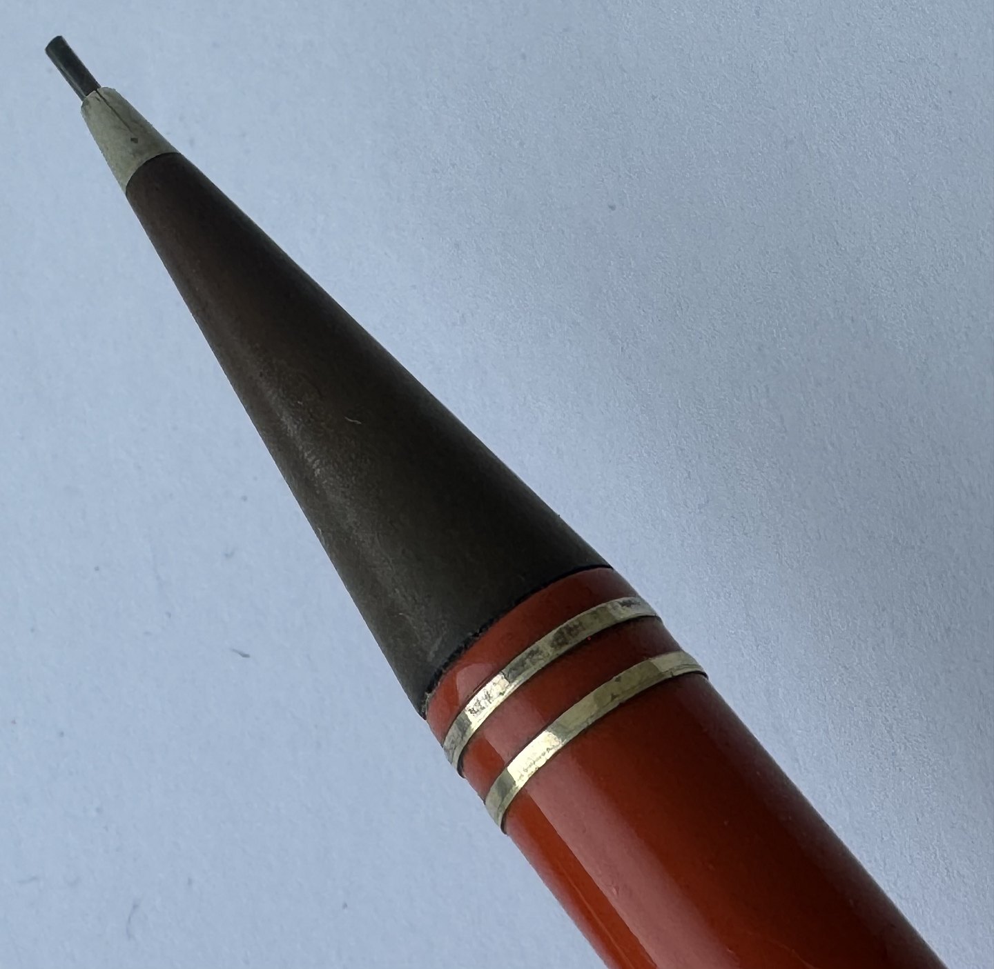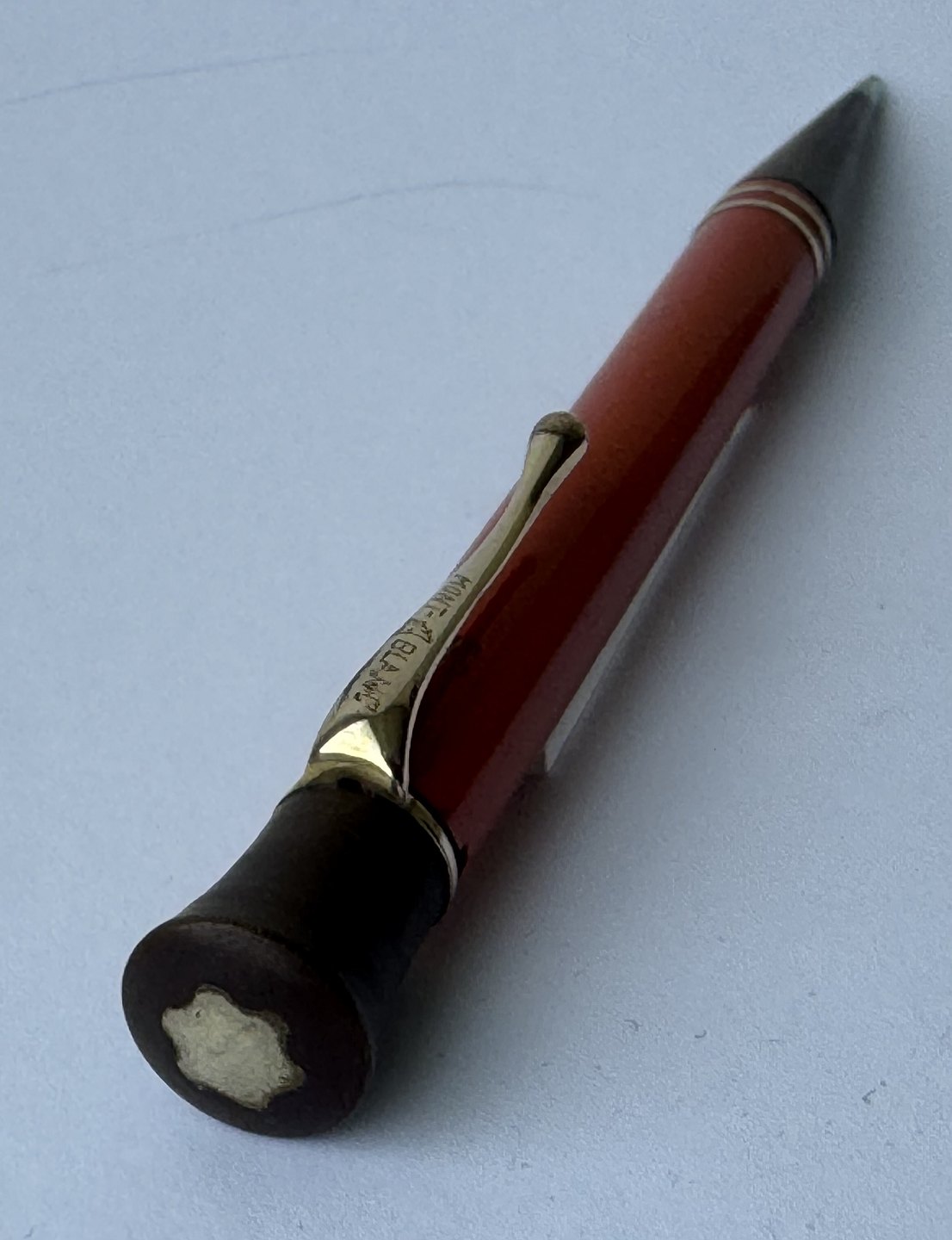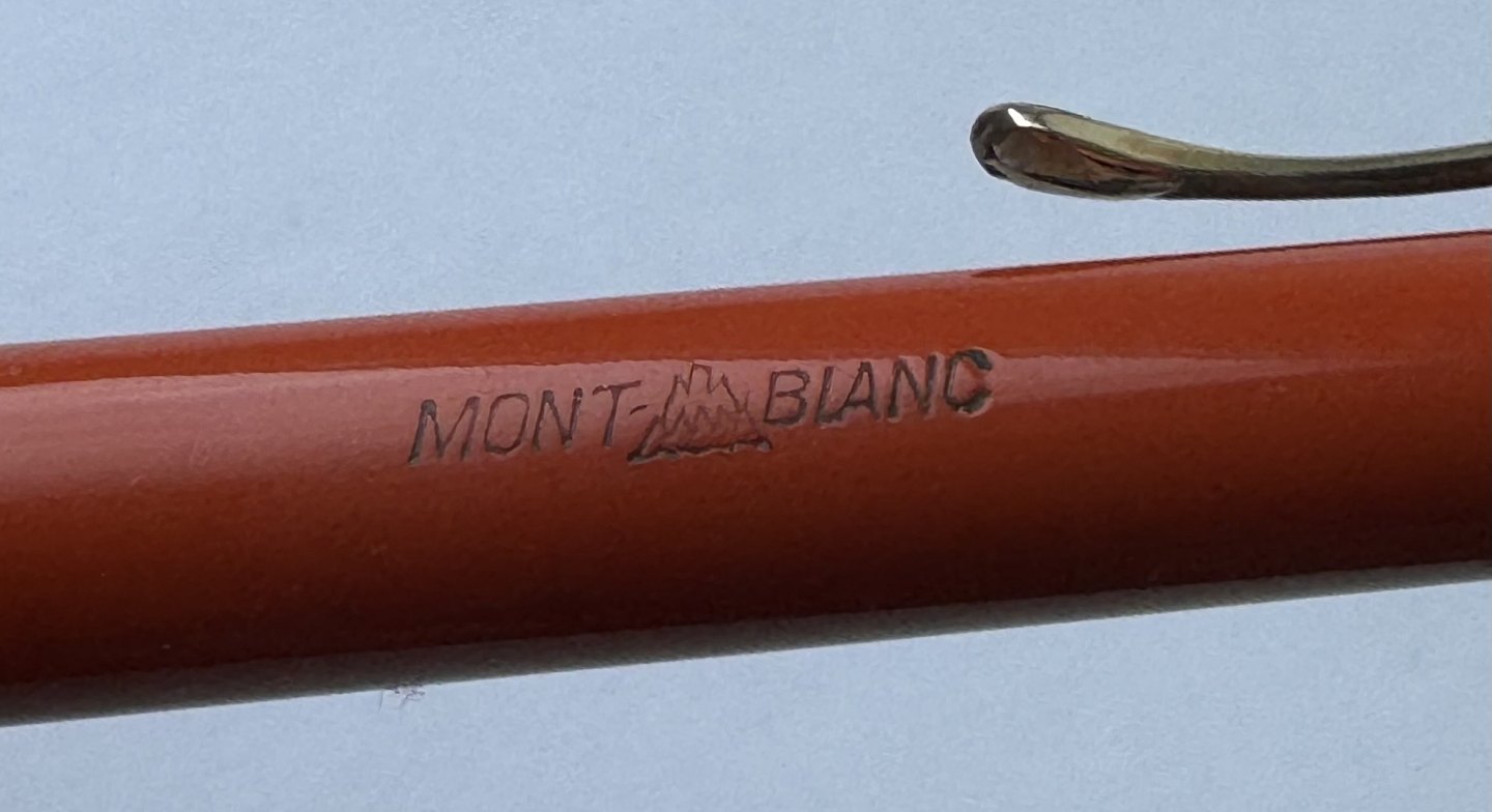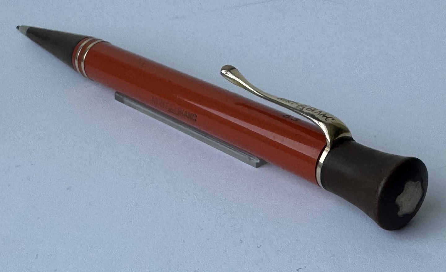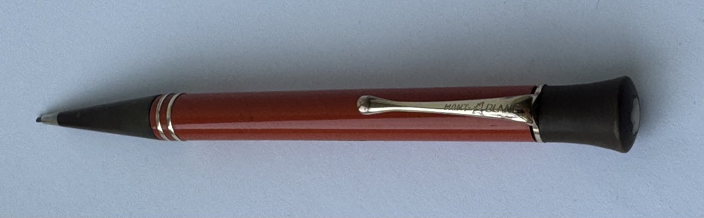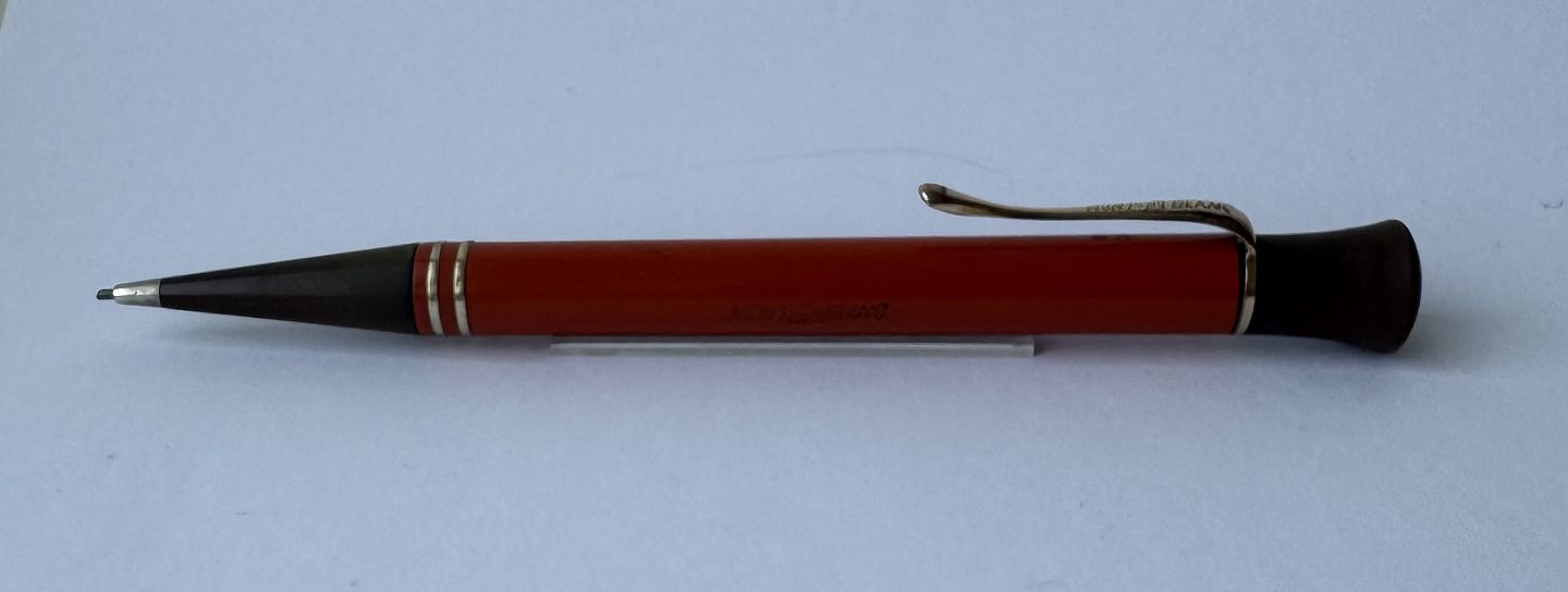 ART DECO PERIOD: Coral red Montblanc no. 53 mecanical pencil with large inset bone-white star on top. Made in the 1920s. Functionality: The pencil tip can be unscrewed, but needs a little help to be screwed back in. Does not screw back naturally when turned counter-clockwise on the top. Imprinted with the factory name MONTBLANC and model number 53. In good condition without damage. Dimensions: 13.5 cm long