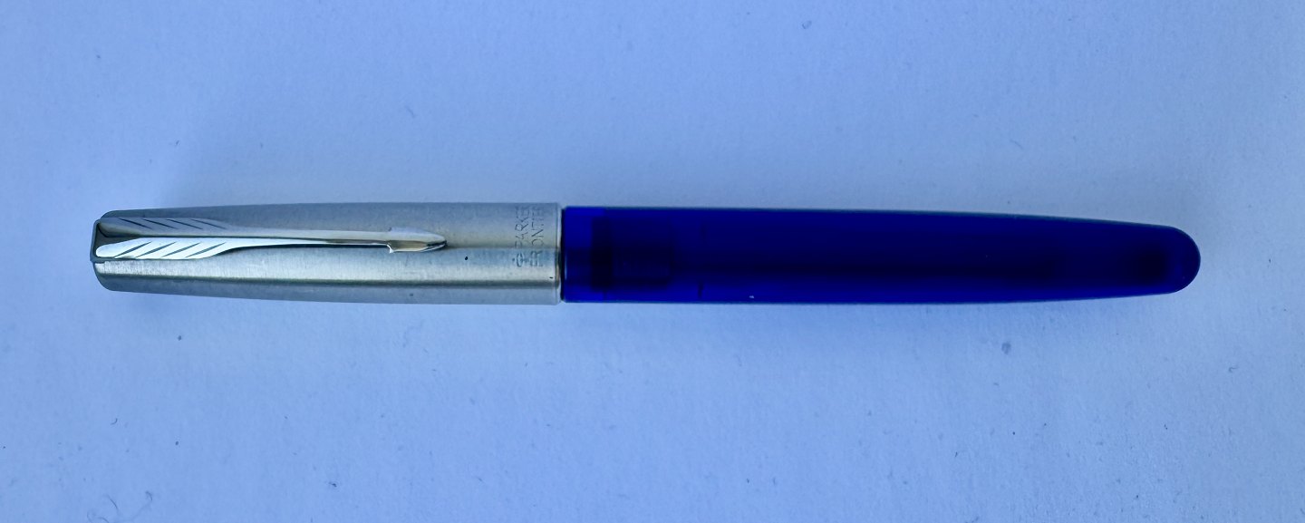 Blue Parker Frontier fountain pen with steel cap. Manufactured from the mid-1990s. Ready to be used when a new ink cartridge is inserted. L. 13.3 cm