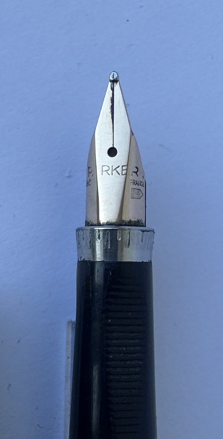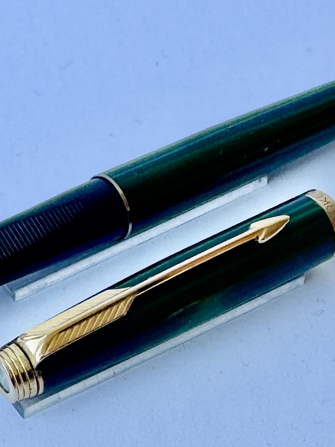 Green striped Parker 75 Malachite Laquer fountain pen from around 1980. Made in France. All parts original including a 14 carat 585 gold nib. The striped decoration is partially erased on the side of the cap (follow the grey arrow in the photo). Otherwise in good condition without damage or repairs. A new ink cartridge must be inserted before it is ready to write again. L. 12.8 cm