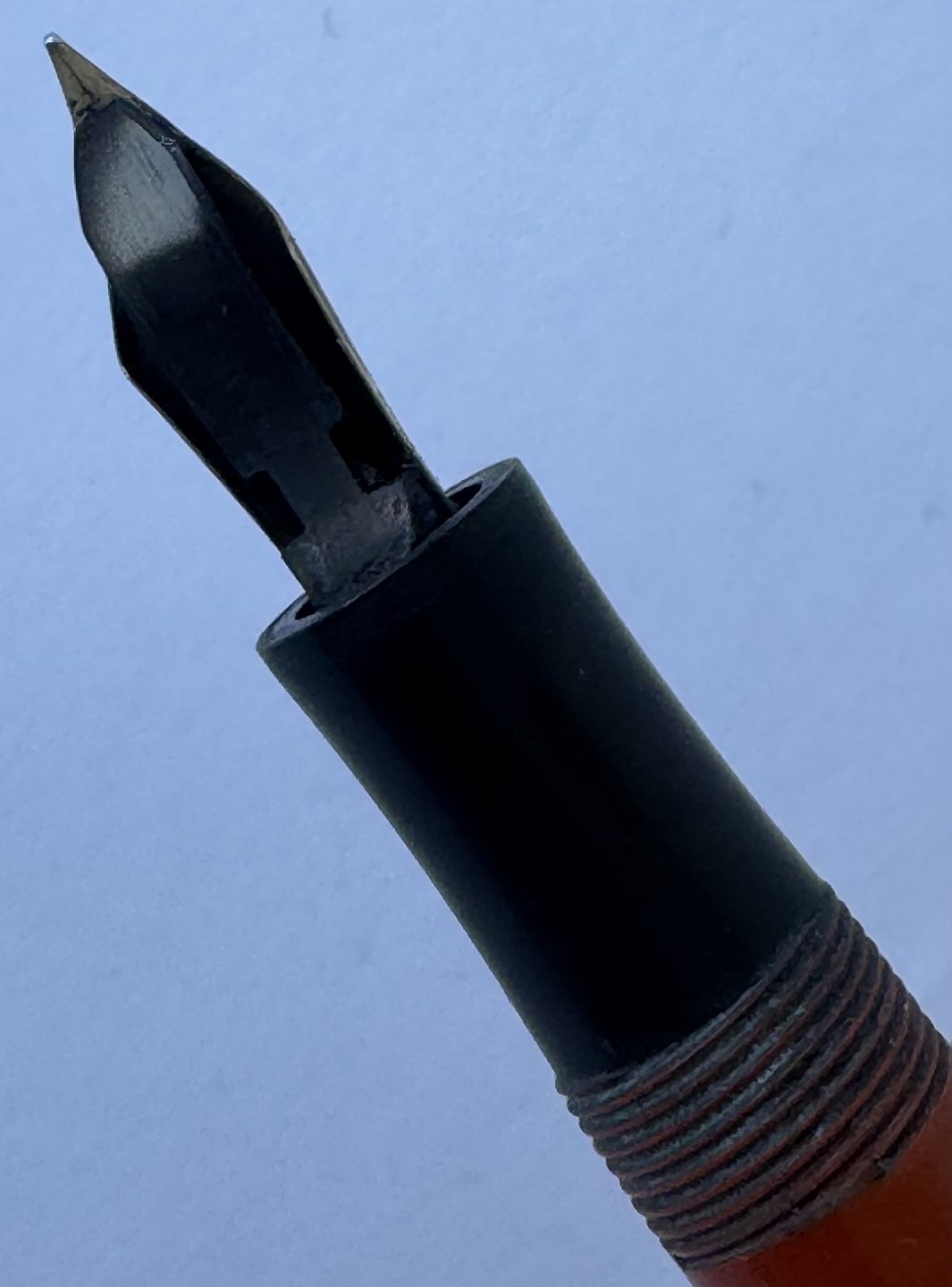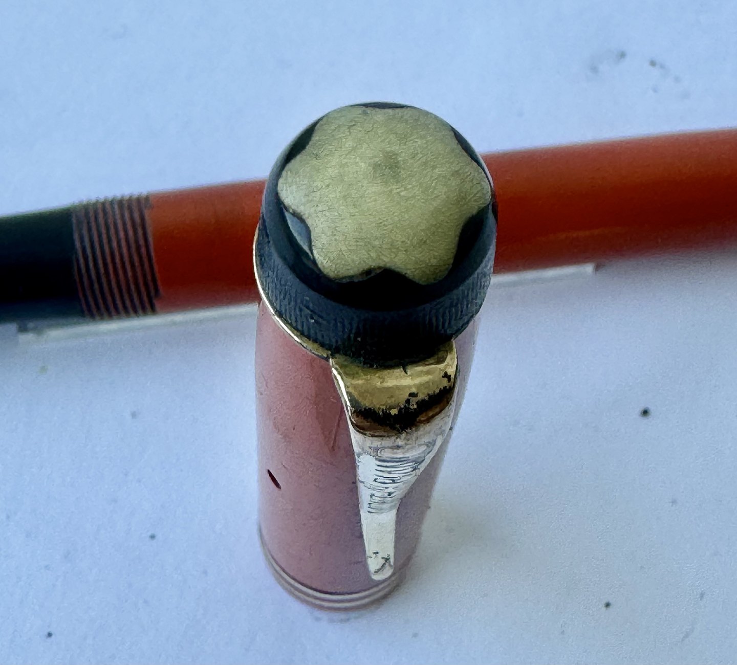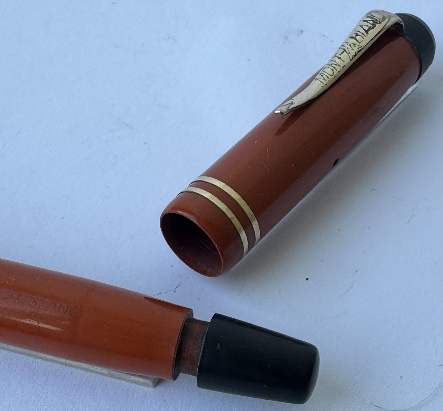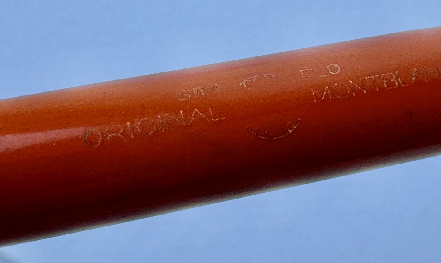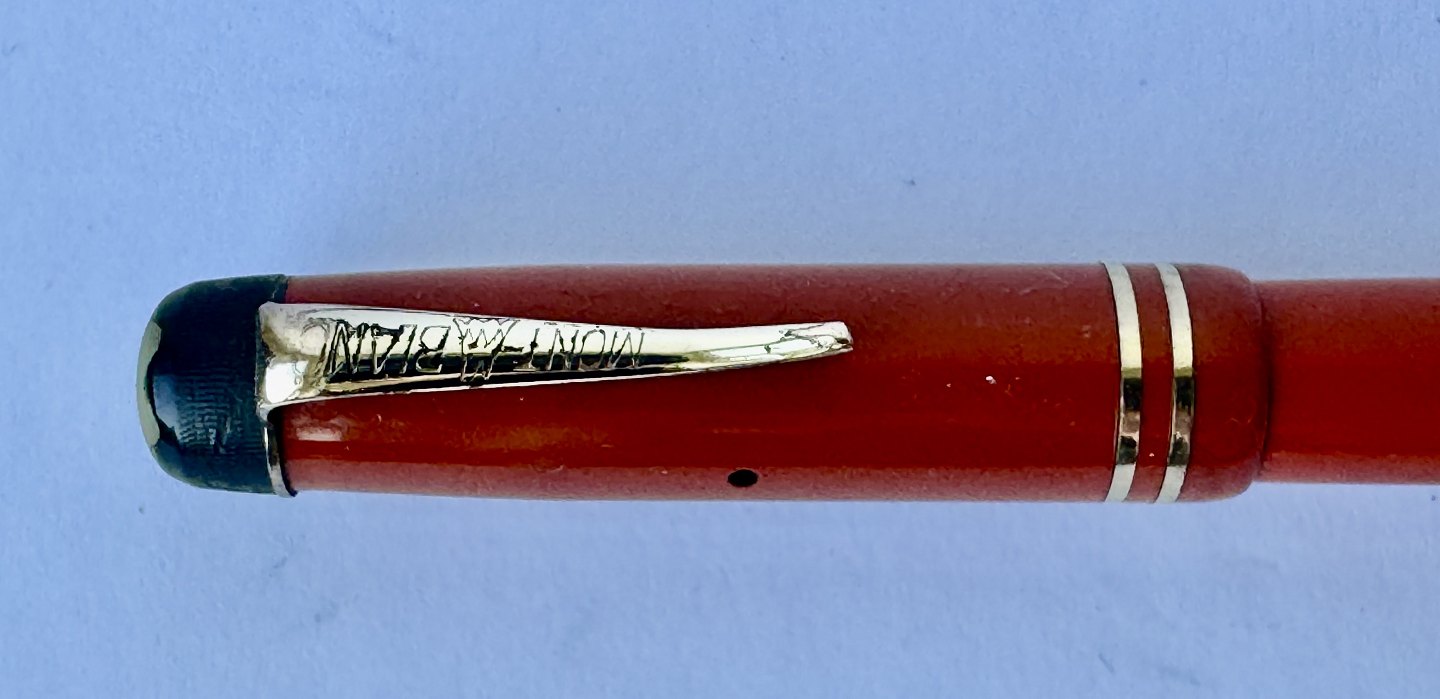 Coral red Montblanc Simplo no. 20 fountain pen. Push button filler. Produced inthe 1930s in Denmark. Slightly faded factory logo on the “body”. The end of the clip is broken. Otherwise no damage or repairs. All parts are original Montblanc from the period including the beautiful 14 carat gold nib. The fountain pen does not work. Dimensions: L. 13 cm