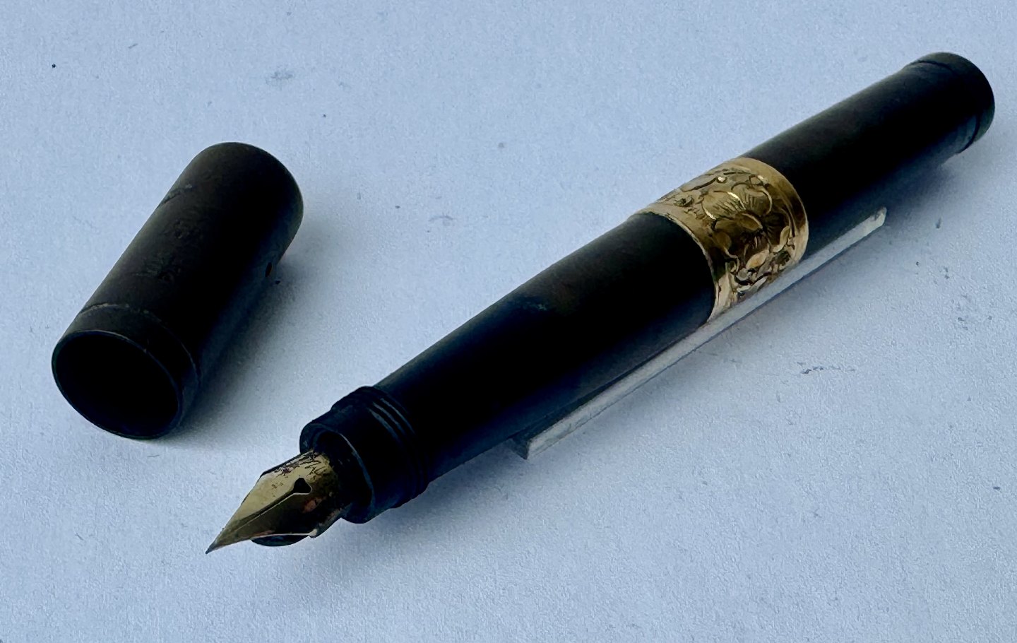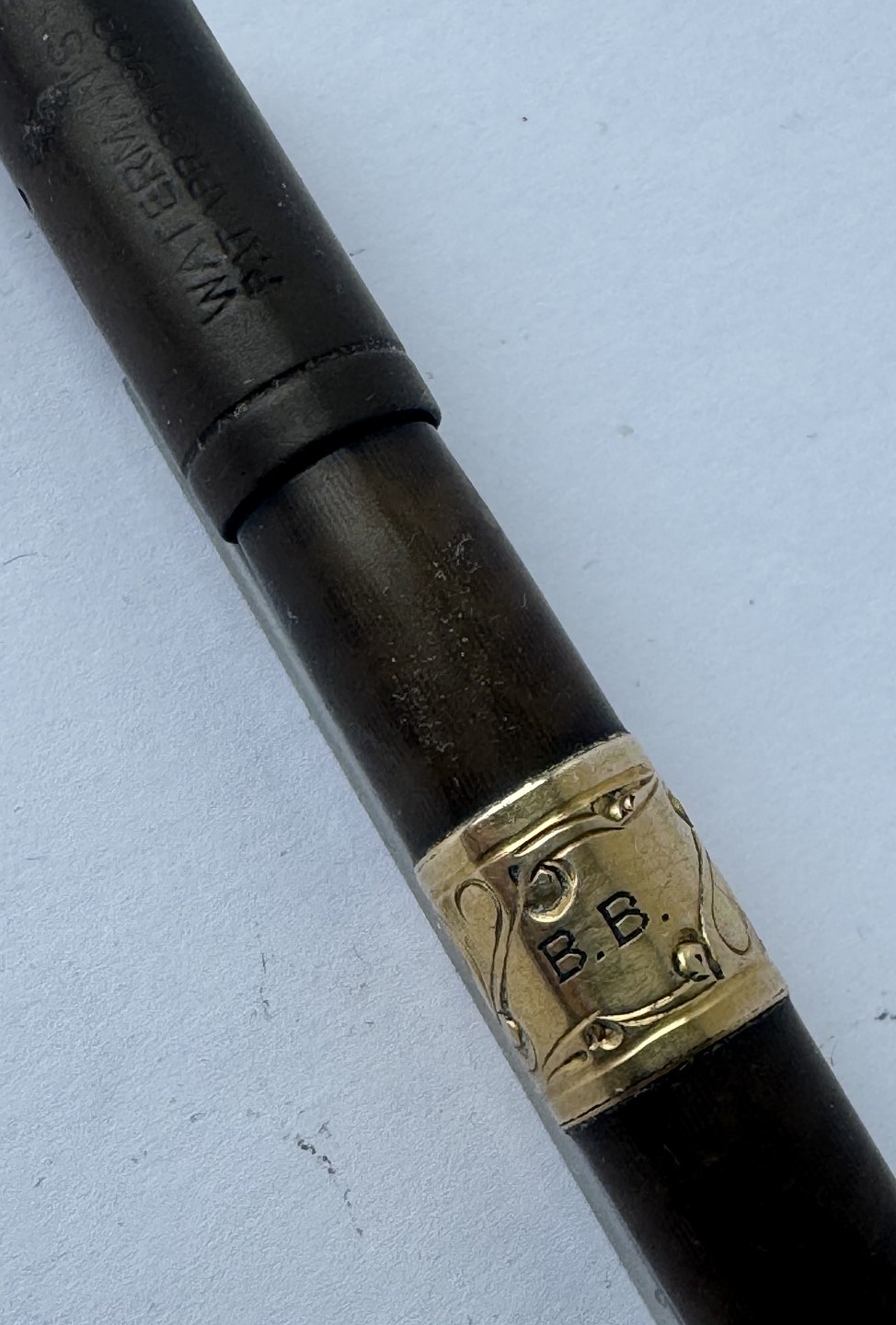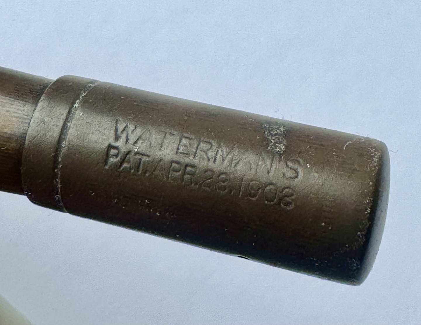 Black Waterman Safety fountain pen from 1903. Model number 42 1/2 V is engraved on the bottom on the pen (see photo). In the middle of the pen is a brass belt decorated with a flower and the owner's initials B. B. The original gold nib moves back and forth when the bottom screw is turned. The cap is engraved WATERMAN'S PAT.APR.28.1903. On the bottom, on the side, you can see faintly engraved WATERMAN and SAFETY. Appears in good condition without damage or repairs. Slight discoloration. Length: 8.7 cm