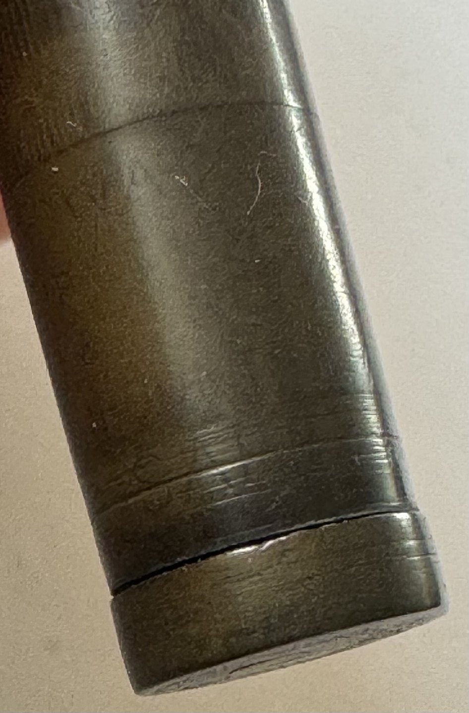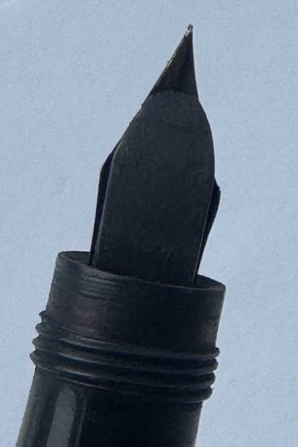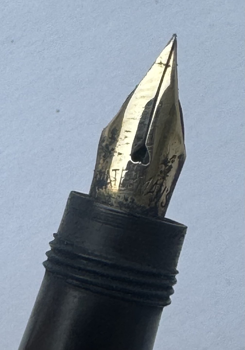 Black Waterman Safety fountain pen from 1903. Model number 42 1/2 V is engraved on the bottom on the pen (see photo). In the middle of the pen is a brass belt decorated with a flower and the owner's initials B. B. The original gold nib moves back and forth when the bottom screw is turned. The cap is engraved WATERMAN'S PAT.APR.28.1903. On the bottom, on the side, you can see faintly engraved WATERMAN and SAFETY. Appears in good condition without damage or repairs. Slight discoloration. Length: 8.7 cm