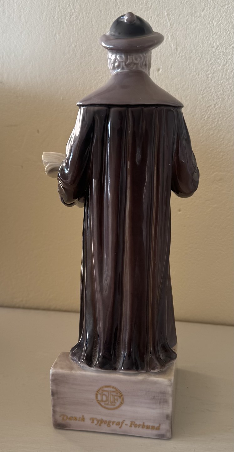 Figur i porcelæn fra Bing og Grøndahl. Forestillende Johann Gutenberg (1397-1468), der opfandt bogtrykkerkunsten, eller forenklet sagt, maskinen der kunne masseproducere tryksager og bøger. Derfor denne figur, der er fremstillet i et mindre oplag på 50 stk. til Dansk Typograf-Forbund. Figuren er brugt som hædersgave fra forbundet.