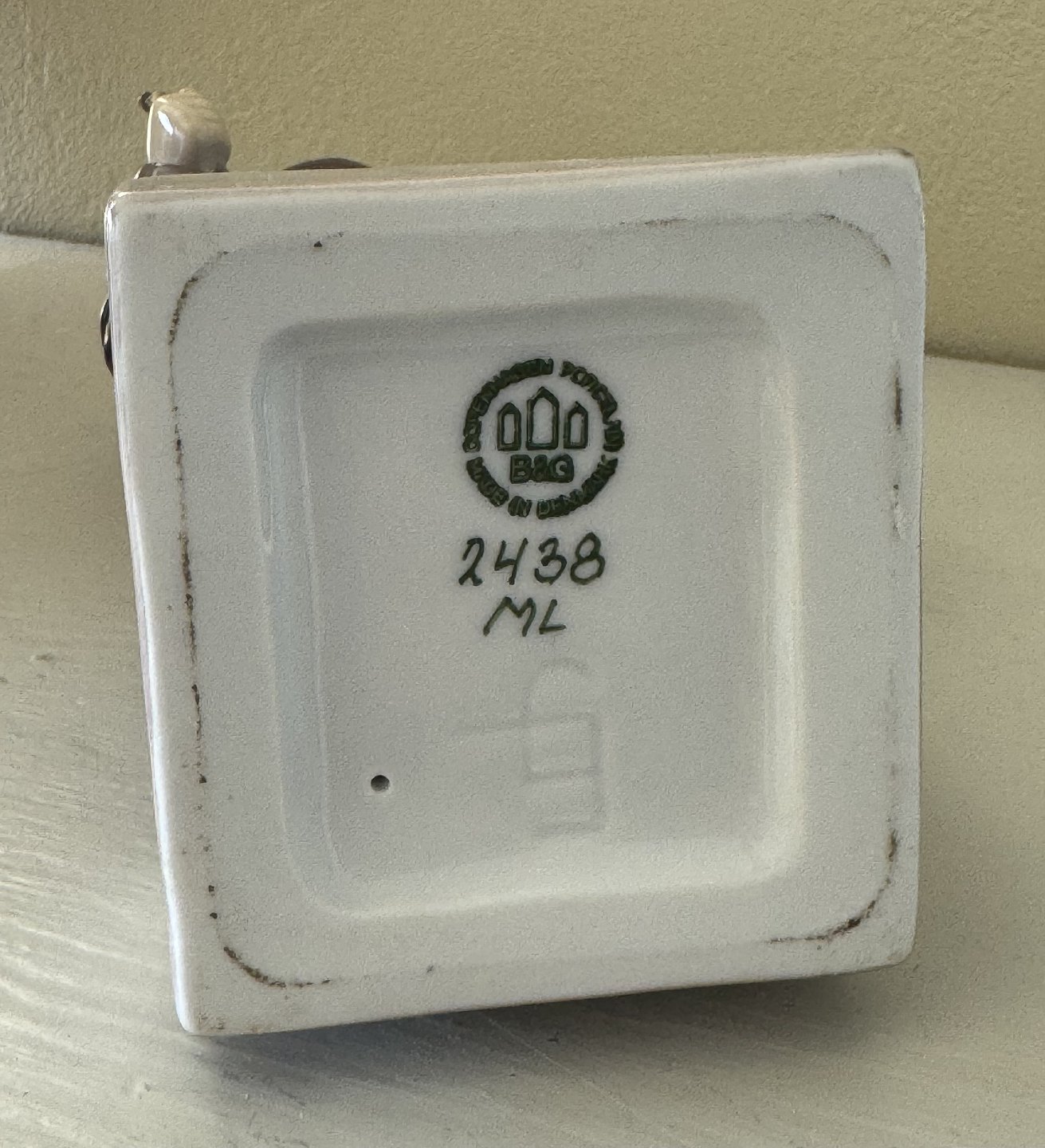 Denne figur er 24 cm høj og fremstår i perfekt stand. 1. sortering. Ingen skader eller reparationer. Fabriksstemplet på bunden samt indridset ubekendt kunstner signatur EJ. Modelnummer 2438.