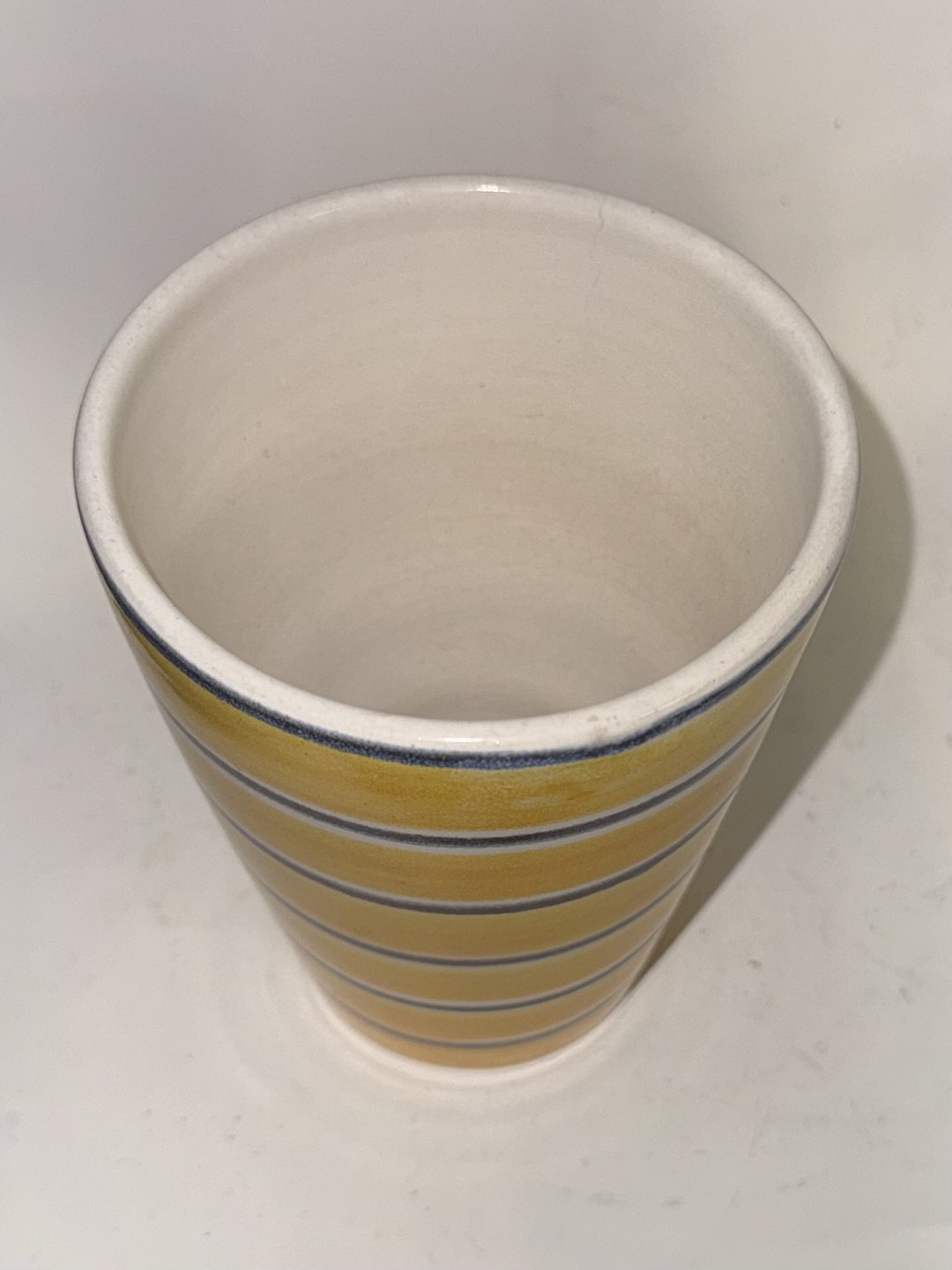 GUL MED STRIBER: Bæger eller vase i keramik fra Lars Syberg fabrikken. Formodes fremstillet i 1960’erne. I god stand. Fabriksmærket på bunden. Mål: 12,3 cm Ø. 9,8 cm