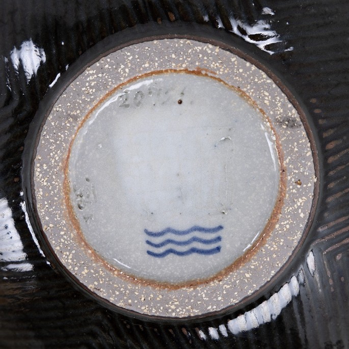 Skål i stentøj med riflet sommerfuglevinge glasur. Signeret.