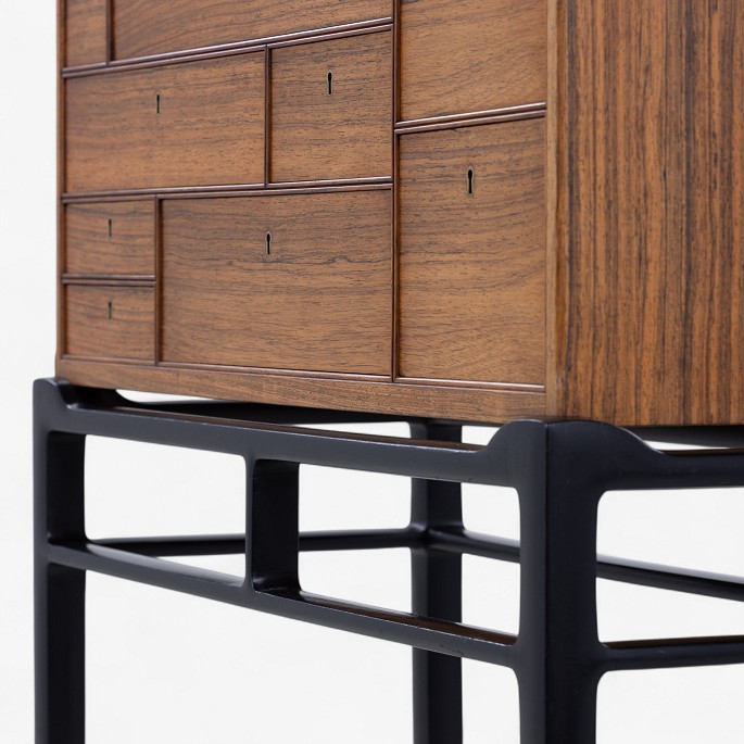 Sjældent skab i palisander med skuffer og sortlakeret stel med messingsko.