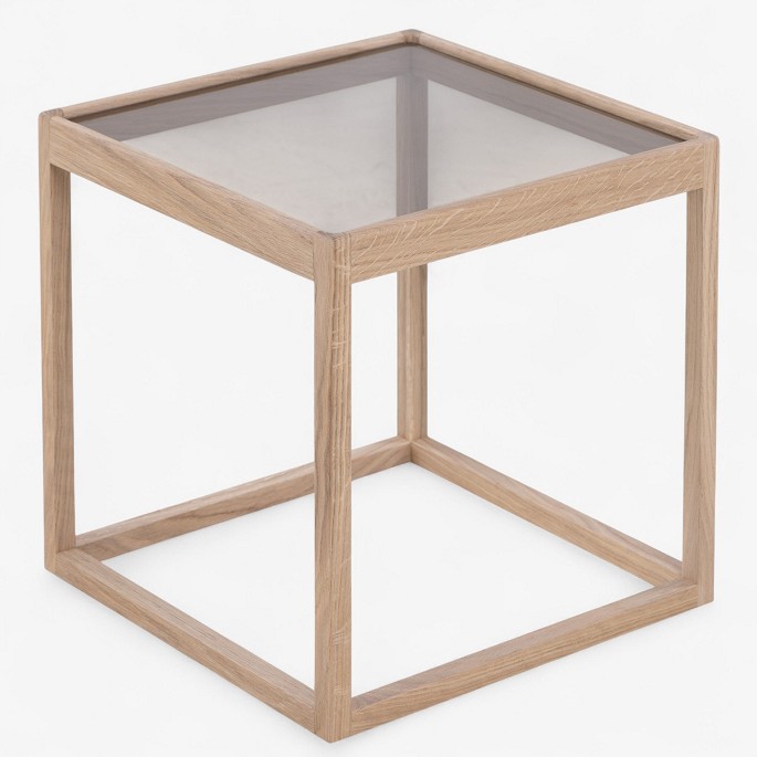 'Cube table' with light oak frame and smoked glass top.