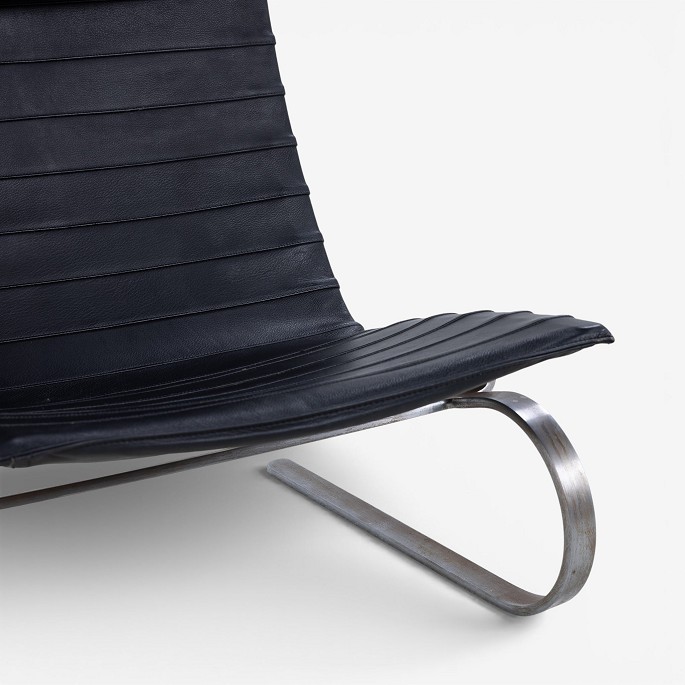 PK 20 - Lænestol i originalt sort læder med nakkehynde og stel af fjederstål. Formgivet i 1968.
