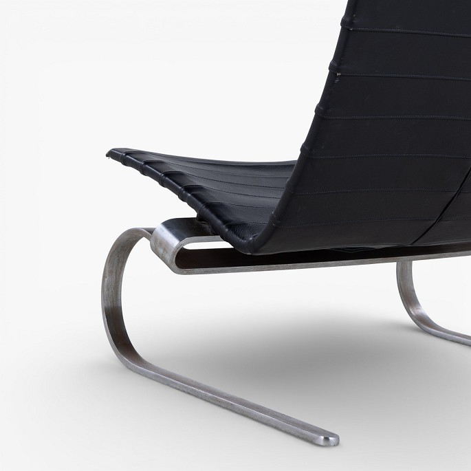 PK 20 - Lænestol i originalt sort læder med nakkehynde og stel af fjederstål. Formgivet i 1968.
