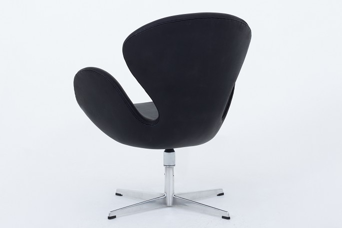 AJ 3320 - "Svanen", nybetrukket i sort Elegance-læder på gl. fod med vippefunktion. Vi tilbyder polstring af Svanen med stof eller læder efter eget ønske. Kontakt os venligst for mere information.