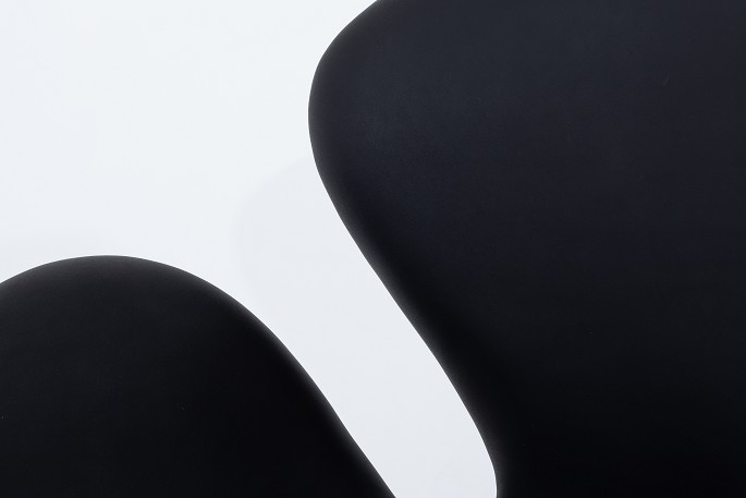 AJ 3320 - "Svanen", nybetrukket i sort Elegance-læder på gl. fod med vippefunktion. Vi tilbyder polstring af Svanen med stof eller læder efter eget ønske. Kontakt os venligst for mere information.