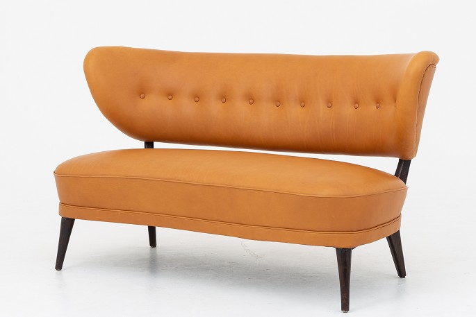 Nybetrukket sofa i Shade Cognac-læder med ben i bejdset bøg