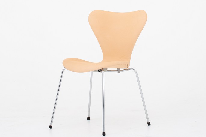AJ 3107 - Nybetrukket "Syver"-stol i naturlæder med stel i stål. Vi tilbyder polstring af stolen med stof eller læder efter eget valg.