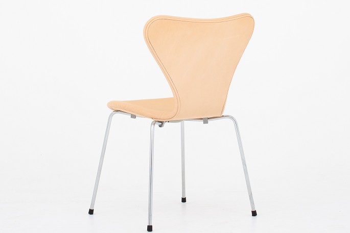 AJ 3107 - Nybetrukket "Syver"-stol i naturlæder med stel i stål. Vi tilbyder polstring af stolen med stof eller læder efter eget valg.