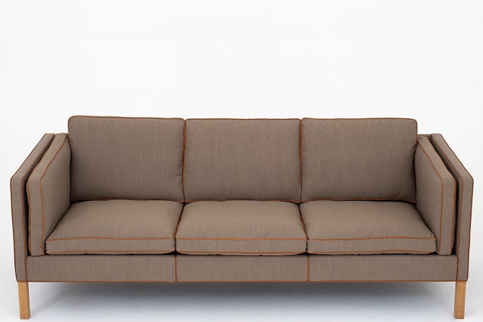 BM 2333 - Nybetrukket 3 pers. sofa i Remix 2-stof (col. 233) med keder i cognac-læder og ben i eg. KLASSIK tilbyder polstring af sofaen med stof eller læder efter eget ønske. Kontakt os venligst for mere information.