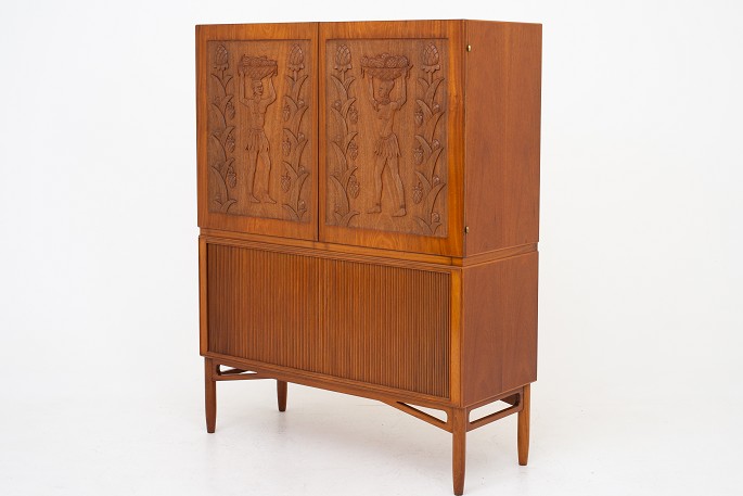Unique linen-press in Honduras-mahogany w. tambour and decorative carvings, from 1950.