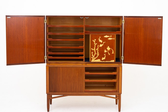 Unique linen-press in Honduras-mahogany w. tambour and decorative carvings, from 1950.