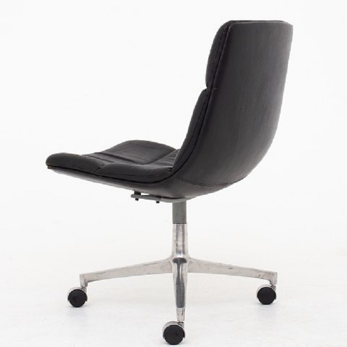 Kontorstol med originalt, sort kanalsyet læder på 3-hjulet stel af matforkromet stål.
