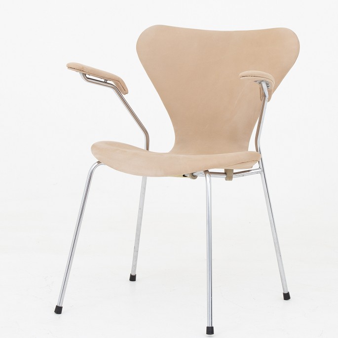 AJ 3207 - Nybetrukket armstol i Royal Nubuck-læder (Ecru) på stel af stål. KLASSIK tilbyder polstring af stolen med stof eller læder efter eget valg.