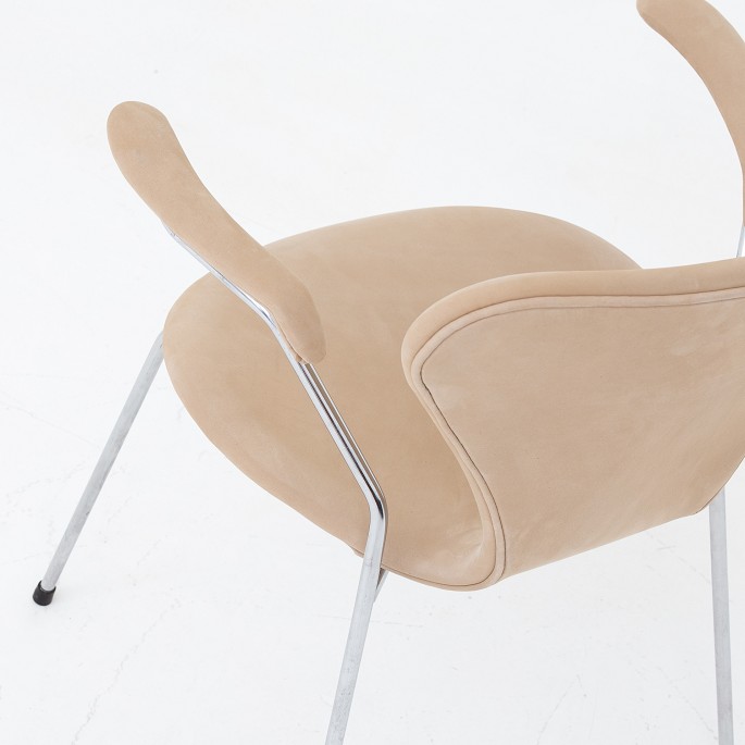 AJ 3207 - Nybetrukket armstol i Royal Nubuck-læder (Ecru) på stel af stål. KLASSIK tilbyder polstring af stolen med stof eller læder efter eget valg.