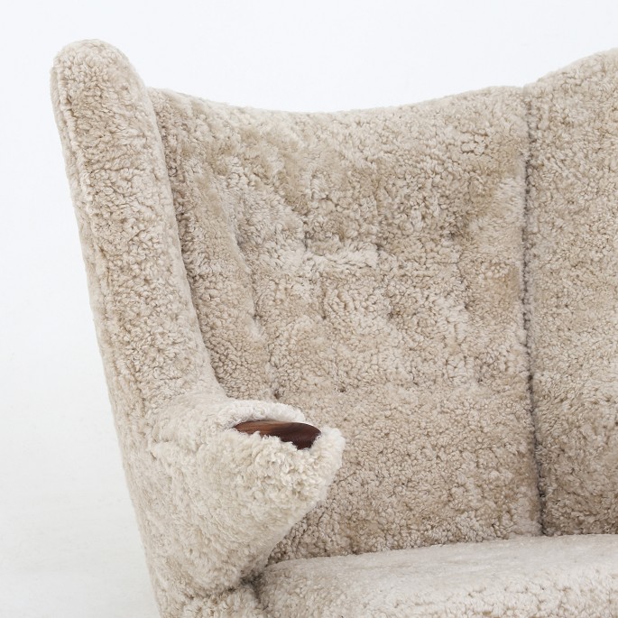 AP 19 - Bamsestol, nybetrukket i lammeuld (Moonlight 09) med mørke ben og poter. Vi tilbyder polstring af Bamsestolen med stof eller læder efter eget valg. Kontakt os venligst for mere information.
