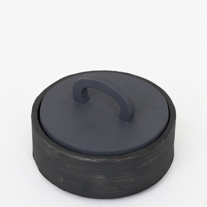 Rund, håndlavet lågkrukke i stentøj og låg af træ.