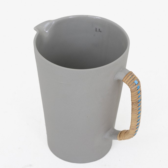 Håndlavet kande i stentøj med grå glasur og flettet hank med blå stribe. Serien 'VAND'.