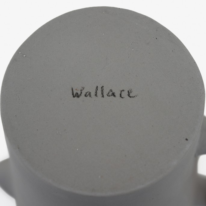 Håndlavet kande i stentøj med grå glasur og flettet hank med blå stribe. Serien 'VAND'.