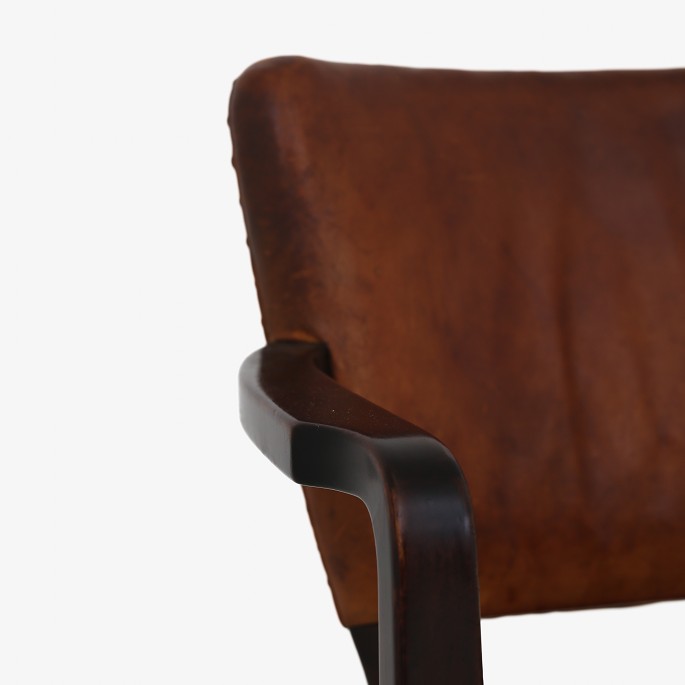 Armchair in stained beech with original patinated aniline leather and brass nails. Stamped by manufacturer.