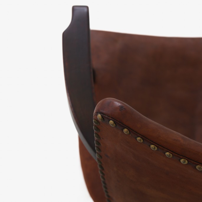 Armchair in stained beech with original patinated aniline leather and brass nails. Stamped by manufacturer.