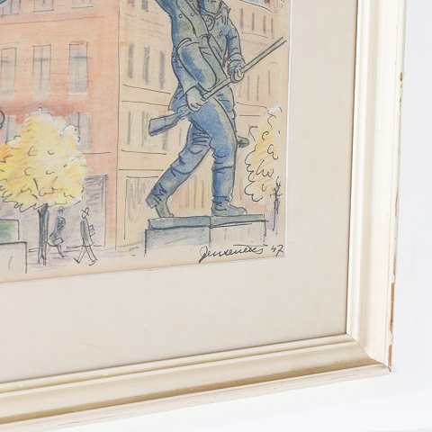 Den Lille Hornblæser'. Tegning fra 1947 i hvid ramme. Signeret.